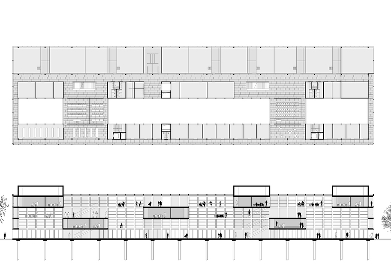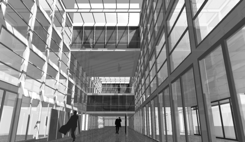 Das Erschliessungssystem ist eine räumliche Vernetzung der komplexen Funktionen und in der Ausformulierung gleichsam eine kleine begehbare Stadt, die mit ihren redundanten und transparenten Wegen eine mehrgleisige Erschliessung darstellt, eine Analogie zu den geistigen Freiheitsgraden, die für einen Hochschulbetrieb die Grundlage bilden. Die Übersichtlichkeit des räumlichen Stadtwegnetzes hilft der Orientierung innerhalb des Gebäudes. In allen Raumschichten und Geschossen ist ein Aussenbezug gewährleistet. Die Transparenz des Gebäudes soll Einsicht in das Arbeiten erlauben und ist darum Bestandteil und Ausdruck vom gegenseitigen Lernen. Sie ist Bühne und Schaufenster zugleich. Die Grenze zwischen Landschaft und Stadtraum wird mittels Transparenz und unterschiedlicher Schichttiefe des Gebäudes verwischt. Indem die Erschliessungswege dreiseitig der Fassade entlang führen, wirkt das Gebäude belebt und aktiv.