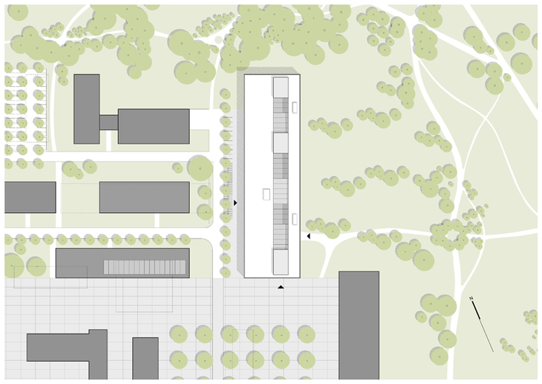 Mit dem neuen Fachbereichsgebäude für Architektur und Innenarchitektur/Design wird ein weiterer Domino-Stein in die bestehende Anlage eingefügt. Die Kompaktheit und Grösse des Volumens generiert dabei eine für den neuen Hochschulstandort Wismar in Massstab und Bedeutung angemessene Erscheinung. Die Breitseite des langen Baukörpers stellt sich der Tiefe der Lübschen Torweide entgegen und vermittelt als Botschafter der Hochschule über die Landschaftsbrücke hinweg zur Mutterstadt Wismar. Mit der schmalen Eingangsseite stösst der Baukörper an die neu geschaffene Plattform, die ihrerseits an alle zentralen Bauten anschliesst und deshalb das Aussenraumforum der Hochschule bildet.