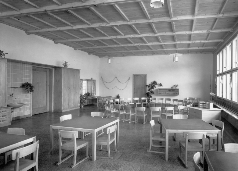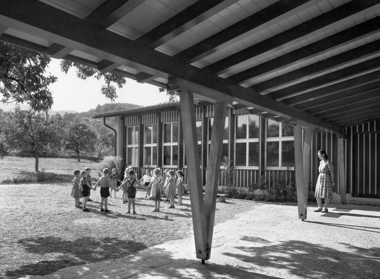 Die früher noch locker bebaute Umgebung liess dem Architekten Rudolf Küenzi (Kilchberg bei Zürich) freiere Hand für die Gestaltung dieses Kindergarten-Pavillons. Ein Wettbewerb (1946) hatte die Grundlage für diesen Bau geschaffen. Die beiden Spielzimmer, jedes mit seinem eigenen Spielplatz im Freien, sind so angeordnet, dass sich beide Klassen auch bei Freiluftunterricht nicht stören. Der Zwischentrakt und die Südostseiten der beiden Spielzimmer sind in Holz konstruiert, die drei andern Saalwände sind aus Backsteinmauerwerk.