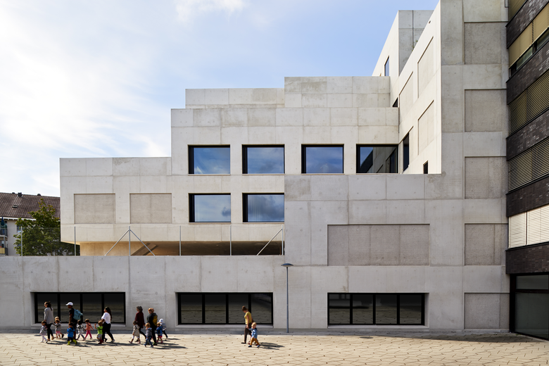Die bestehende städtebauliche Figur findet im mehrfach abgetreppten Volumen des Primarschulhauses ihren Abschluss. Der öffentliche Charakter des Gebäudes manifestiert sich in der Fassadengestaltung ebenso wie in der Materialisierung. Mit dieser Setzung entsteht auf entspannte Art eine vielfältige, gebrauchstaugliche Schule mit neuartiger Typologie und klaren und qualitätsvollen Aussenräumen. Die Struktur der gestuften Geschosse in Verbindung mit der Überlagerung der Turnhallen bietet eine wunderbare Grundlage zur Entwicklung hallenartiger Erschliessungen und kaskadenartiger Treppen, fluchtwegbefreit und somit uneingeschränkt nutzbar, da über die Dachgärten geflüchtet werden kann.
