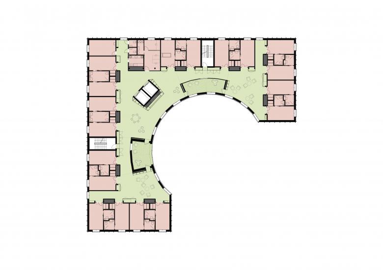 Wir haben mit dem Projekt für das Pflegezentrum am Bruderholz eine neue Typologie für Pflegeheime entwickelt, bei welcher die Zimmer konsequent vierseitig nach Aussen orientiert und den Aufenthaltsbereich auf einen gemeinsam erlebbaren Freiraum richtet. In diesem Heim gibt es Bewohnende, welche 20 Jahre und mehr an diesem Ort leben. Umso wichtiger sind hier gute Räume für den gemeinsamen Aufenthalt, wo Menschen zwar Nischen haben und dennoch sichtbar bleiben, wo sich den Menschen auf ihrem Stockwerk eine reiche Welt offenbart, eine Welt um bestehende grosse Bäume herum, die sich im Zyklus des Jahres sich immer neu präsentieren. Um diese Bäume herum entwickelt sich ein zirkulärer Aufenthaltsraum, der die notwendige Erschliessung mit den Aufenthaltsräumen koppelt und so einen wunderbaren Begegnungsraum schafft, der pro Geschoss auf die drei geforderten Wohngruppen zugeteilt werden kann Denn der Ersatzbau folgt weitgehend dem Fussabdruck des leider typologisch kaum anpassbaren Vorgängerbaus, nutzt dessen Baugrube und erlaubt so den Weiterbestand der kapitalen Bäume.
