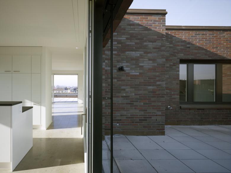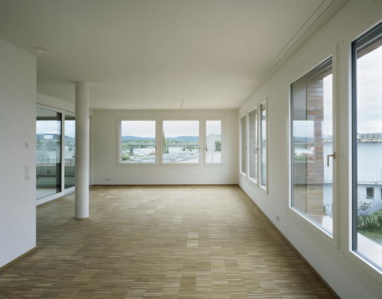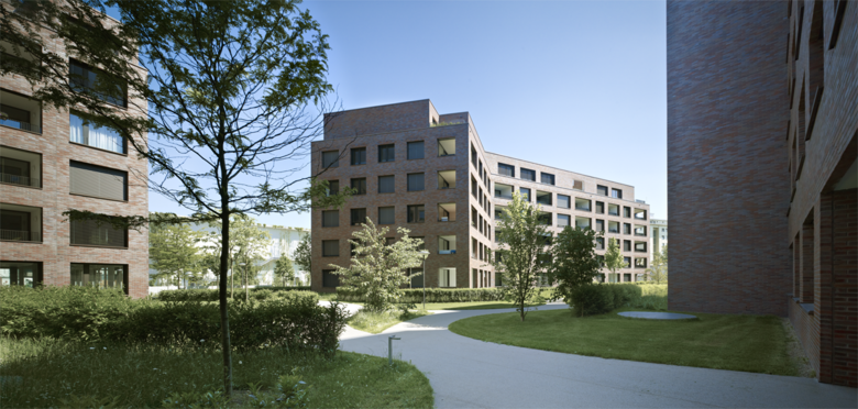 Die beiden sechsgeschossigen Wohnbauten vermitteln geschickt zwischen bestehenden Blockrandfragmenten, Einzelbauten und dem angrenzenden, grossmassstäblichen Einkaufszentrum. Auf dem vormals industriell genutzten Areal entstanden 99 Wohnungen ganz unterschiedlichen Typs und Charakters. Trotz hoher Dichte ermöglicht die Abwinkelung der Baukörper gezielte Ausblicke ins Weite und diagonale Blickbezüge innerhalb der Überbauung. Zudem entstehen mehrdeutige Aussenräume, die spürbar gefasst und dennoch von fliessender Offenheit sind. Während der nördliche Baukörper orthogonal strukturiert ist, sind beim südlichen die Erschliessungskerne leicht ausgedreht, wodurch die Wohnungen an Grosszügigkeit gewinnen.