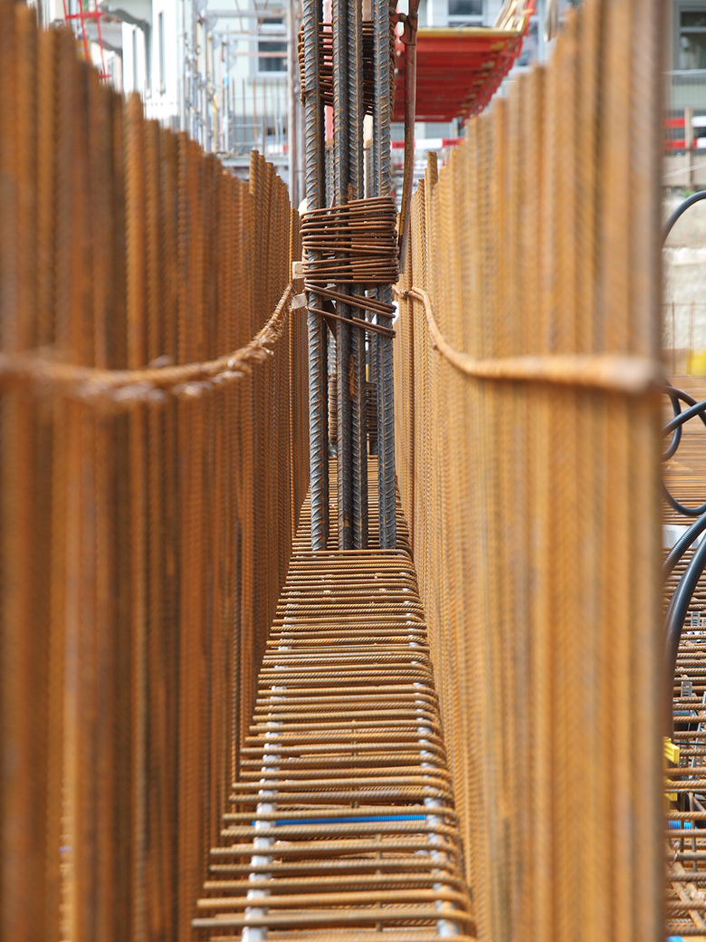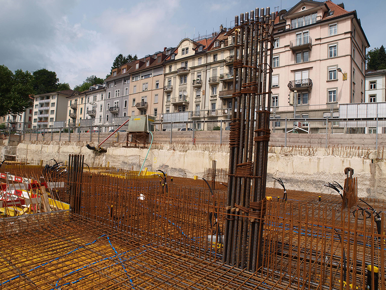 Im 1. und 2. Untergeschoss, wo vorherrschend Technikräume angeordnet sind, werden die Lasten des darüber liegenden Sockelteils über raumhohe, ebenfalls vorgespannte Wandscheiben derart verteilt, dass in den darunter liegenden Geschossen optimale Verhältnisse für ein komfortables Parking entstehen. Die Untergeschosse wurden im Schutz einer ca. 15m hohen rückverankerten Schlitzwand erstellt.