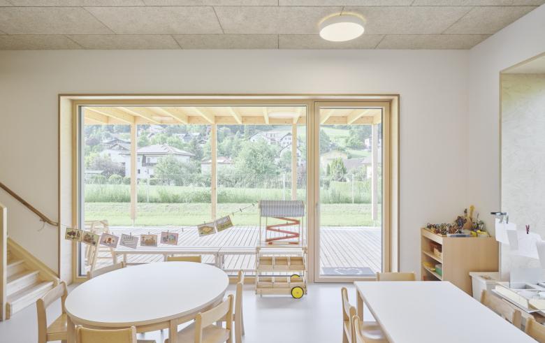 Der zur Zufahrtsstraße eingeschossig-wirkende Kindergarten mit rhythmisierter Holzfassade beheimatet 75 Kinder in 3 Gruppen und bietet ausreichend Spielfläche mit Nutzung des Hanggrundstückes als Rodelbahn. Die notwendige Aufstockung auf 4 Gruppen wird vorgesehen und kann bei Bedarf als drittes Geschoss aufgestockt werden.