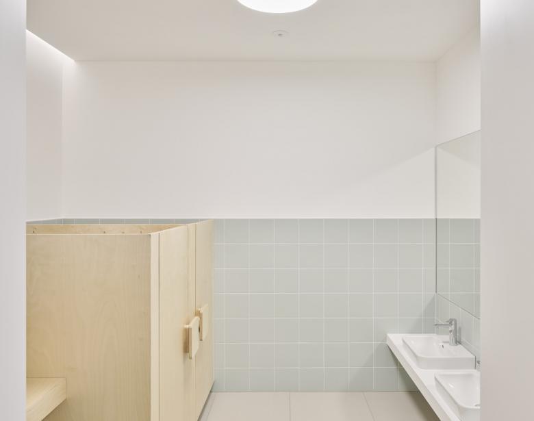 Jede Gruppe erhält eine zweiseitige Belichtung, der Bewegungsraum wird mittig eingestellt. Die Eingangssituation wird über eine großzügige mit frei eingestellter Garderobe als durchlaufende Achse ausgebildet.