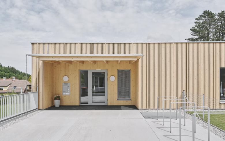 In unmittelbare Nähe zum markanten Kirchenhügel, nebst der bestehenden Volksschule und in Laufdistanz zum örtlichen, öffentlichen Nahverkehr, wird ein neuer 3-gruppiger Kindergartens situiert. Das nach Norden abfallende Grundstück wird mit einem abgetreppten Baukörper bestmöglichst ausgenutzt. Die im Süden vorgelagerte Spielebene bleibt dadurch größtmöglich erhalten.