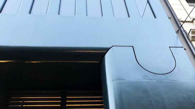 "Die Fassade der Obergeschosse besteht aus nahtlosen, fünf Millimeter dickem Stahlblech in das die identischen Fenster eingestanzt sind. Wie bei den Waggons der SBB sind die Ecken abgerundet und leicht nach innen abgekantet, um die Stabilität zu gewährleisten. Die Fassade wurde in fünf vertikalen Einzelteilen angeliefert und an Ort verschweisst. Sie hängt am Randträger der Decke des dritten Obergeschosses . Mit dem dunkelgrünen Anstrich wollte der Architekt den Kontrast zu den Sonnenschutzgläsern minimieren, um eine flächige Fassade zu erzeugen."