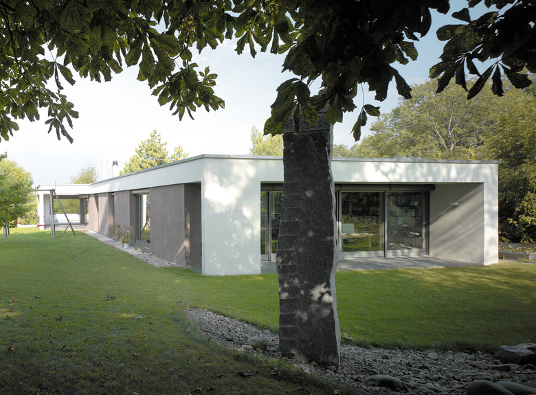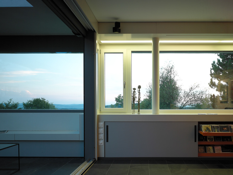 Neben diesen Anliegen verfolgten wir die Ziele, den Gartenbezug erlebbar zu machen, stärker zwischen öffentlicher und privater Seite zu unterscheiden und die bisher kaum erlebbare Aussicht zu thematisieren. Differenzierte Öffnungen im Osten, Süden und Westen des Volumens und die Offenheit der Anbindung der neuen Räume machten dies möglich. Die zugrundeliegende Raumabfolge Loggia – Wohnen – Gang – Büro – Loggia ergibt in West-Ost-Richtung eine Art Symmetrie, unter der sich alle weiteren Entscheide einordnen lassen. Auch die Fassadengestaltung folgt diesem Konzept: unter einem weissen Rahmen, der sich von Loggia zu Loggia spannt, steht der dunkel verputzte, beidseitig vollkommen offene „Wohnkörper“.