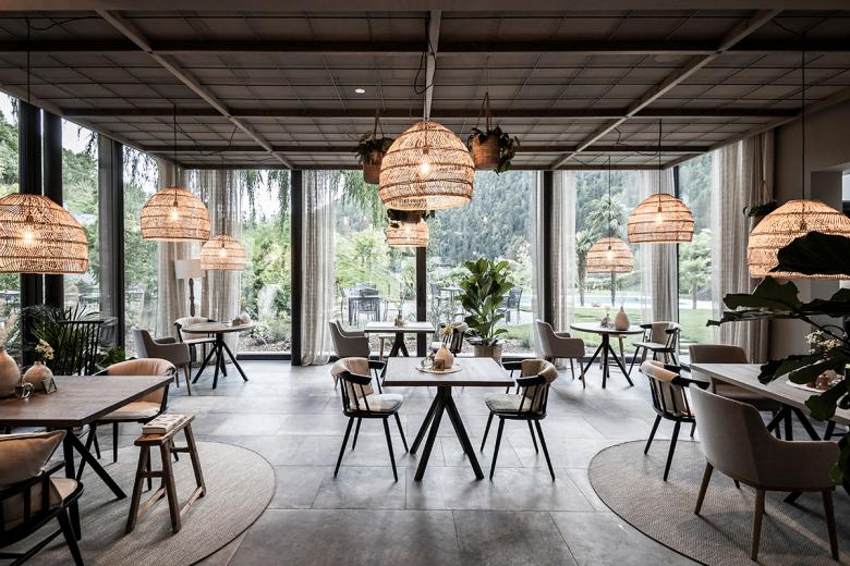 The concept of the restaurant’s expansion design centres around the principle of three rooms or “cubes” with differing heights. The inner decor is based on the theme and mood of a modern winter garden: the ceiling offers a unique structure on which plants and lighting can be flexibly hung. The open space is divided by loose old-styled cupboards and floor-to- ceiling permeable shelves. These shelves function as a transparent room divider, a presentation area for the hotel’s self-made products and as a library stocked with literature on culinary arts. These features create a cosy and inviting living room atmosphere. A natural spring water fountain allows for a refreshing drink. And as a unique highlight - there’s no classic buffet. Instead, guests are invited to tuck into treats displayed on an old planning bench, while in a séparée, a specially designed piece of furniture with fixed and mobile elements provides chilled and warm culinary delights, and can also be used for wine or food tastings. Even the tables and chairs in the light-flooded guest-rooms defy the usual stereotype, with a lively mixture of round and angular displays.