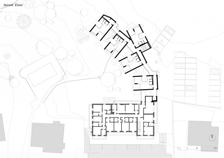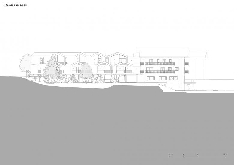 At the outset, the idea was to separate the building with the new suites from the original site in order to leave the grounds untouched and occupy as little space as possible. A building at ground level would have resulted in the loss of sizeable portion of the grounds. But the idea was not just a row of rooms door to door, but an orderly grouping of intimate, self-contained tree houses elevated on three-metre high supports, leaving the grounds fully accessible underneath. At the same time, there was a growing desire not only to accommodate guests in the new suites in the park, but to allow them to be a part of it. During the design process the park became the central theme of the architecture, thoroughly embedding the building within the nature, as if it had always been there.