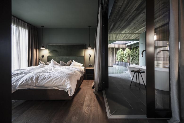 The new "Floris Green Suites" are no less spectacular inside than they are outside. The conventional living, bedroom and bathroom areas have been reimagined in an unusual way. The central living area opens out onto a sheltered balcony overlooking the magnificent mountain scenery, a benefit also afforded by the glass bedroom. Everything is confluent: Rooms, functionality, exterior and interior. Only the toilet and bidet has been designed as a self-contained unit. A free-standing vanity unit with mirror, which can also be used as a console desk, provides a pivotal point. This is where the bathroom area merges into the living area, which has been wonderfully designed with hybrid furniture. The most intimate area is located at the far end of the suite, where the entrance is: an open shower is elegantly flanked on one side by the self-contained toilet and bidet unit, and on the other by a small, private Finnish sauna, which guests can use whenever they wish. In addition to the many views and vistas, there is another highlight that makes a stay in the Green Suite irresistible: an open patio with an outdoor hot tub, which complements the sauna offer in an exceptionally appealing way.