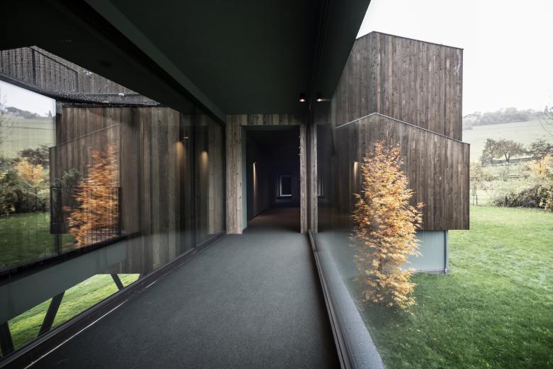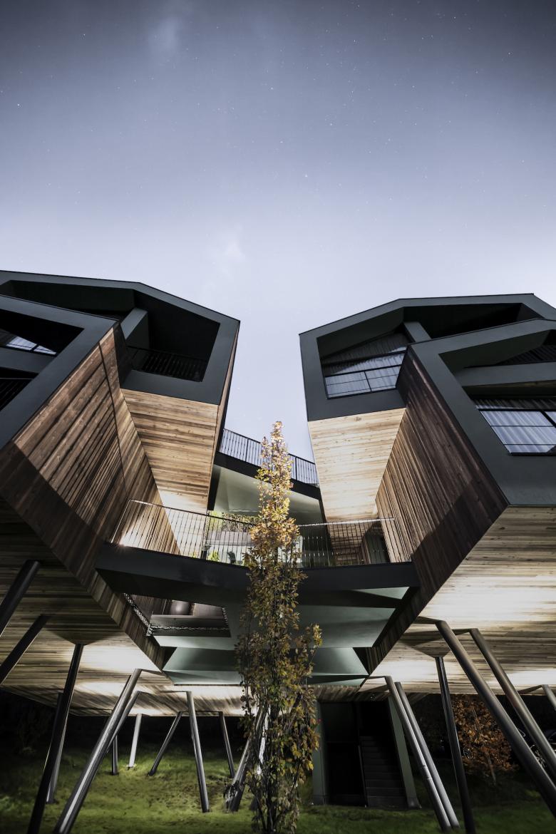 The intellectual concept of tree houses began to take shape: at the end of the connecting walkway that forms the backbone of the new development is the two-storey structure containing the suites, with five rooms on each floor, all of which have views over the park. In order to make the architectural complex even more dynamic, the rooms are located above each other at a slight angle, creating the impression of a natural, grown structure while preserving the views. Guests have the sensation of being ensconced in their own little house. Despite this architectural openness, the appearance of the whole building is preserved, as it nestles into the park landscape. This is anchored by a pre-grey wooden façade, which confers a degree of uniform tranquillity to the unique cluster of tree houses.