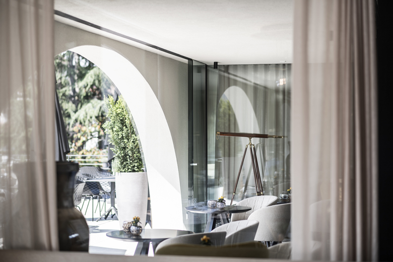 The timelessness of the Art Nouveau buildings at Ritten entail, is captured in the interior and carried out in an abstract manner. At the same time a kind of clear, contrasting and consistent framing of elements forms a recurring detail, which can be traced throughout the entire building. Also the theme of the arch finds its continuation in the interior, for example in the rooms as a mirror that is rounded at the bottom, as a fireplace in the lounge, where the arch is extruded around its own axis, or as the lounger’s backrest at the spa terrace. The furniture is mostly freestanding and loosely positioned, elegant and plain upholstery enhance the ambience. Amidst everything are unique finds from flea markets or little treasures from the previous hotel. Dispersed throughout the building are golden lamp sculptures hanging from the ceilings.