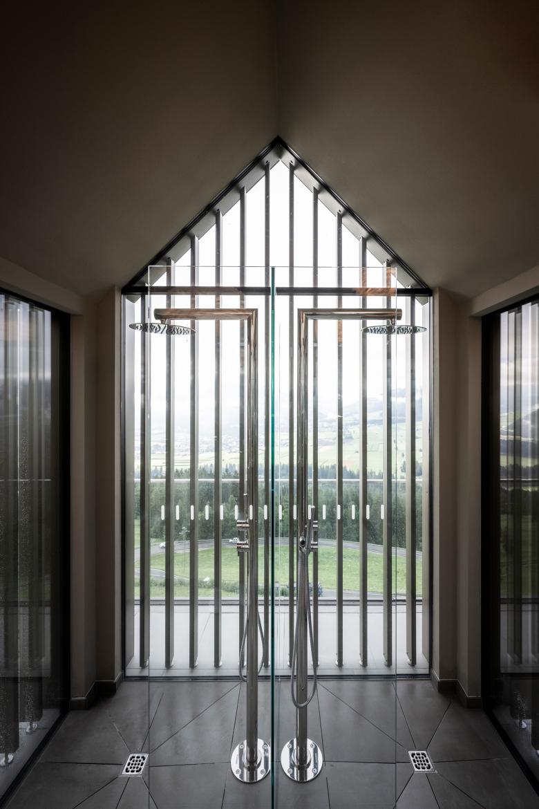 The two levels are characterised by a different treatment of privacy, with mainly exposed spaces above and protected spaces below. On the upper floor are two whirlpool baths, two panoramic showers and a changing room. The lower floor is a textile-free area: the central, enclosed part houses the foyer. From here one has access to the soft sauna, the Finnish sauna, a shower cabin, an ice mist shower and a third outdoor pool, from where one's gaze can sweep over the surrounding landscape.