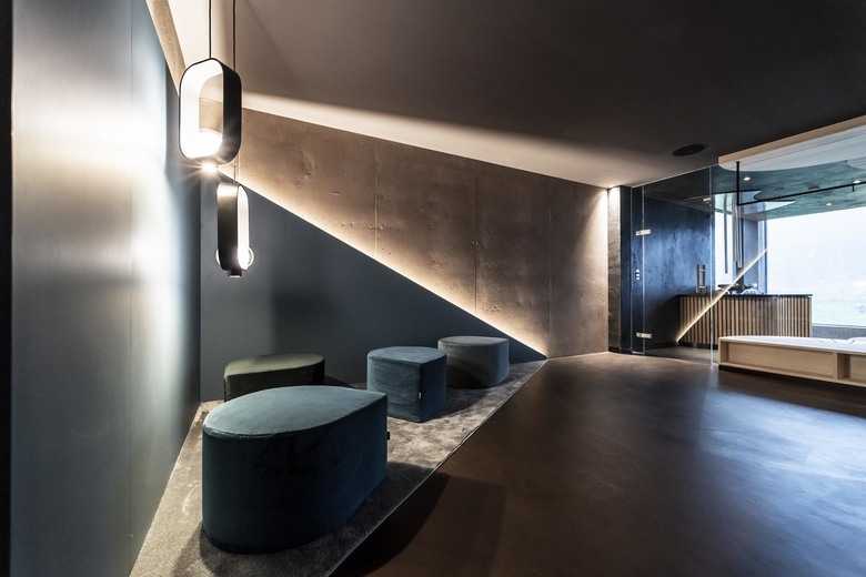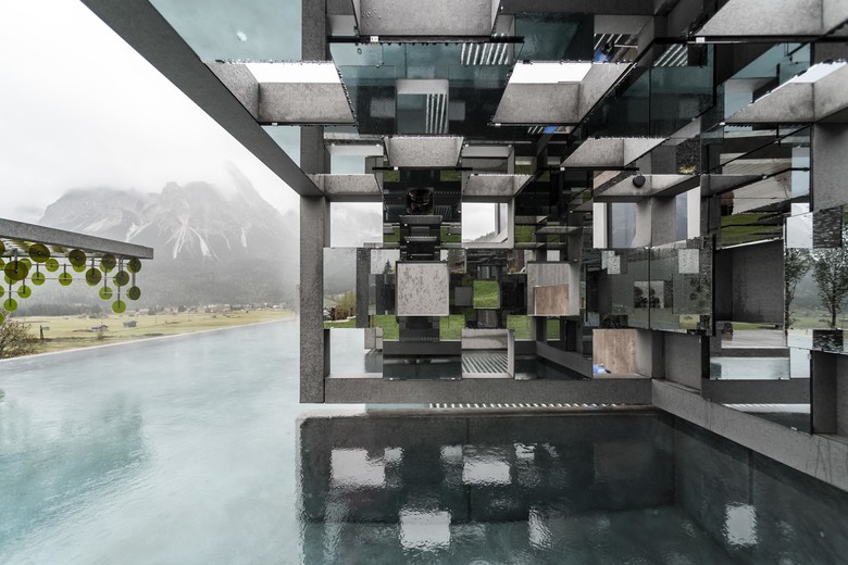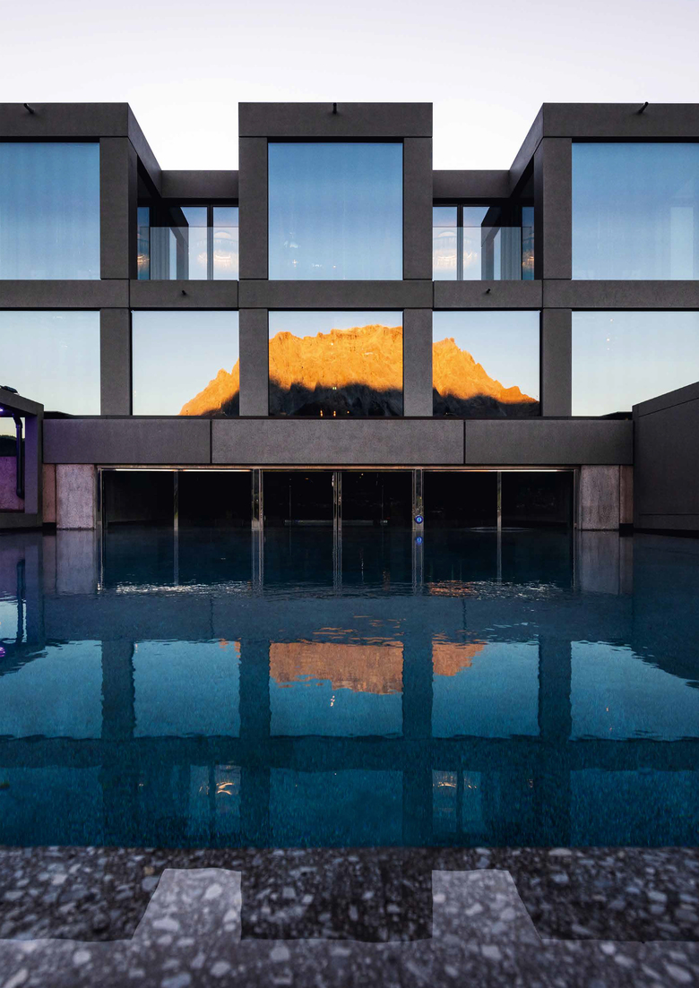 Moreover, using a reflective glass surface delivers an unexpected, scenic effect: the different shapes virtually fade into the background and meld into a ‘screen’ mirroring the gargantuan silhouette of the Zugspitze. And there’s more. The pool runs flush along the length of the Spa’s glass front, thus doubling the image of the mountain thanks to impactful chromatic mirror effects.