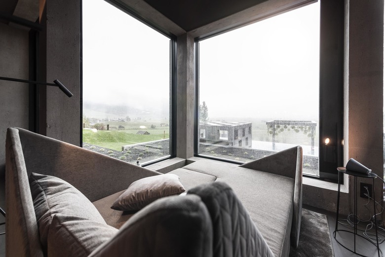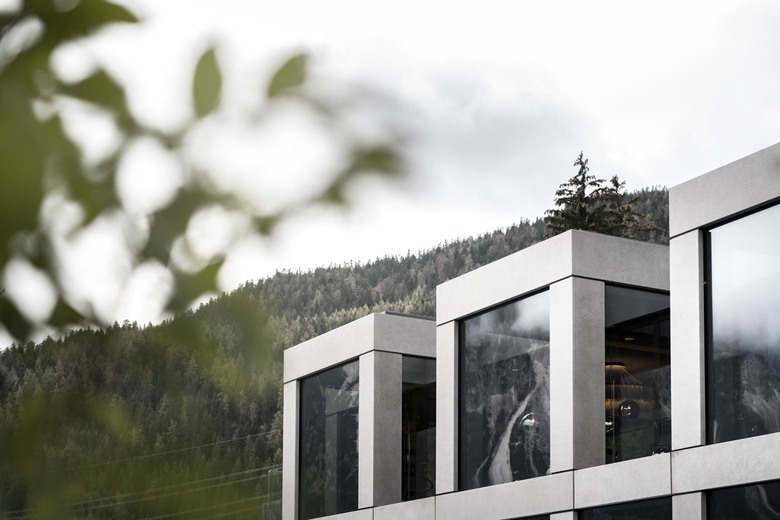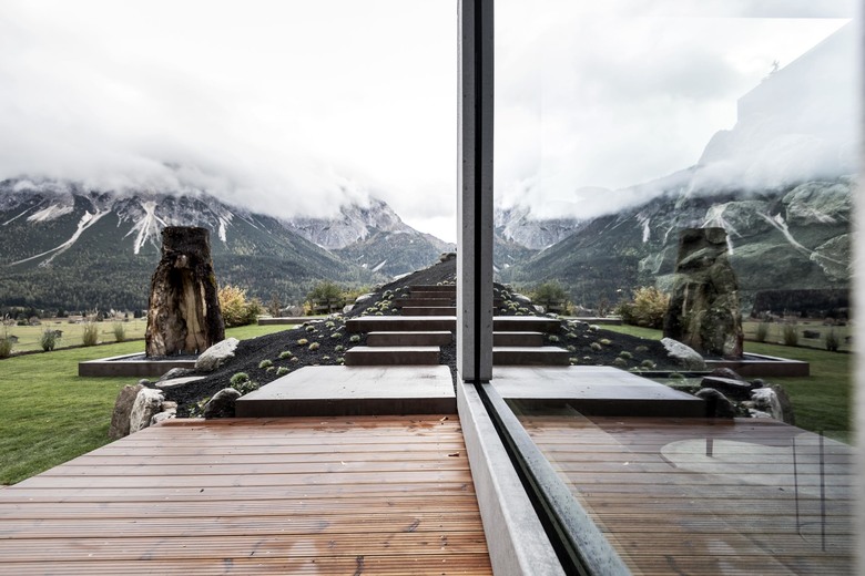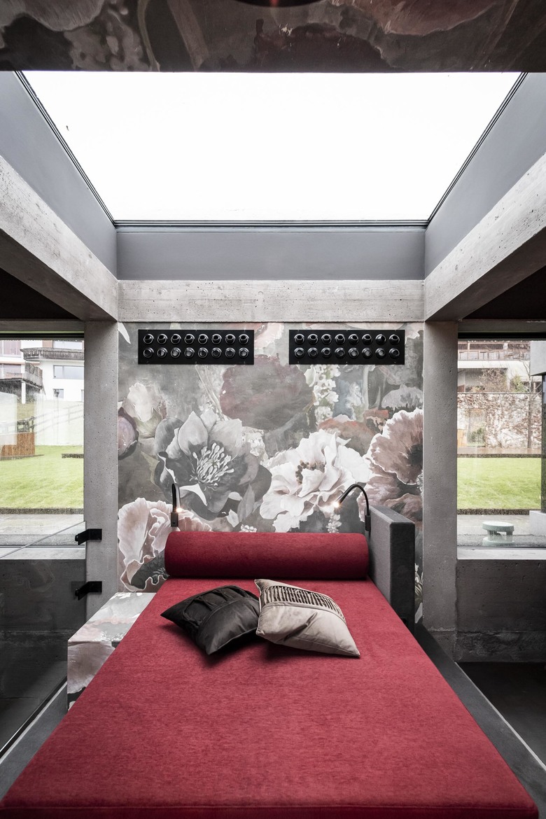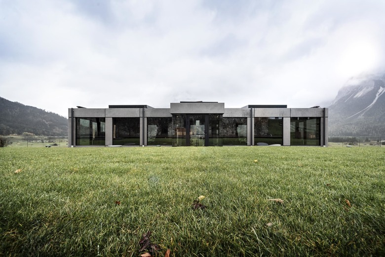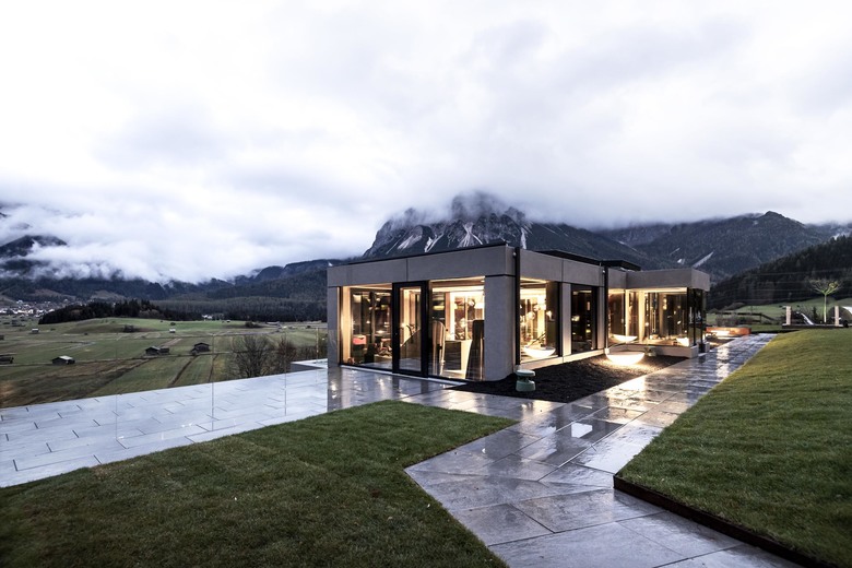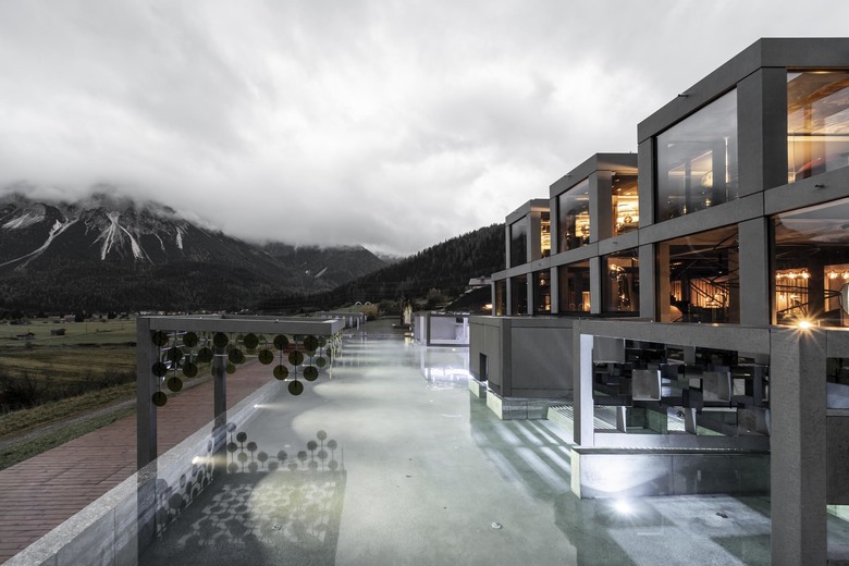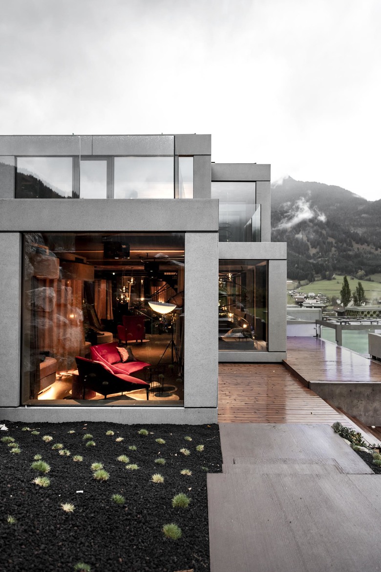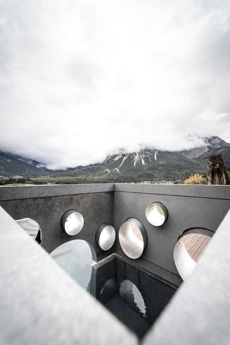 The new glass and cement structure was built organically on a gentle slope located below the hotel. It features a unique view across the spacious Ehrwalder Becken valley peppered with old farmhouses and barns; what’s more, the imposing 3,000 metres of the Zugspitze mountain – which represents a geographical border between Austria and Germany – overlooks the entire valley.