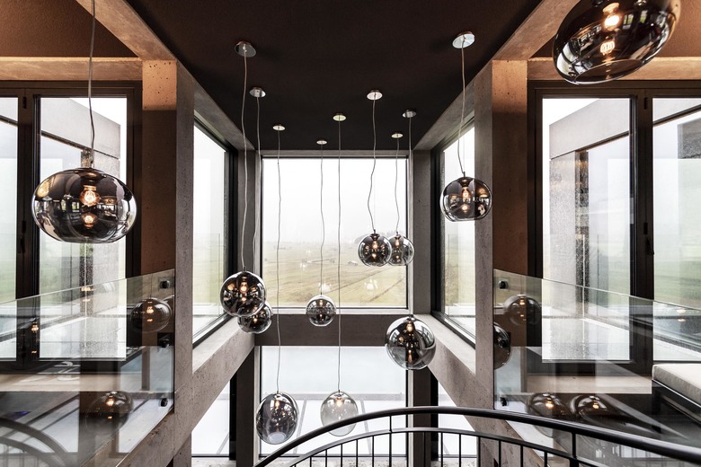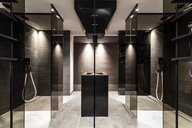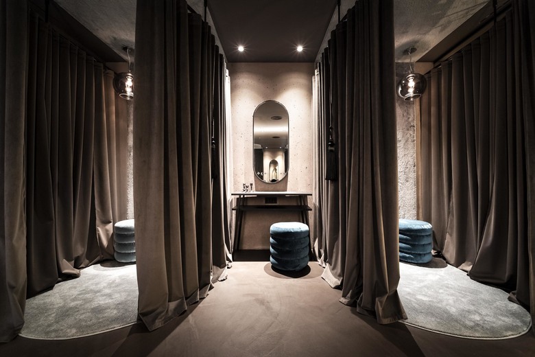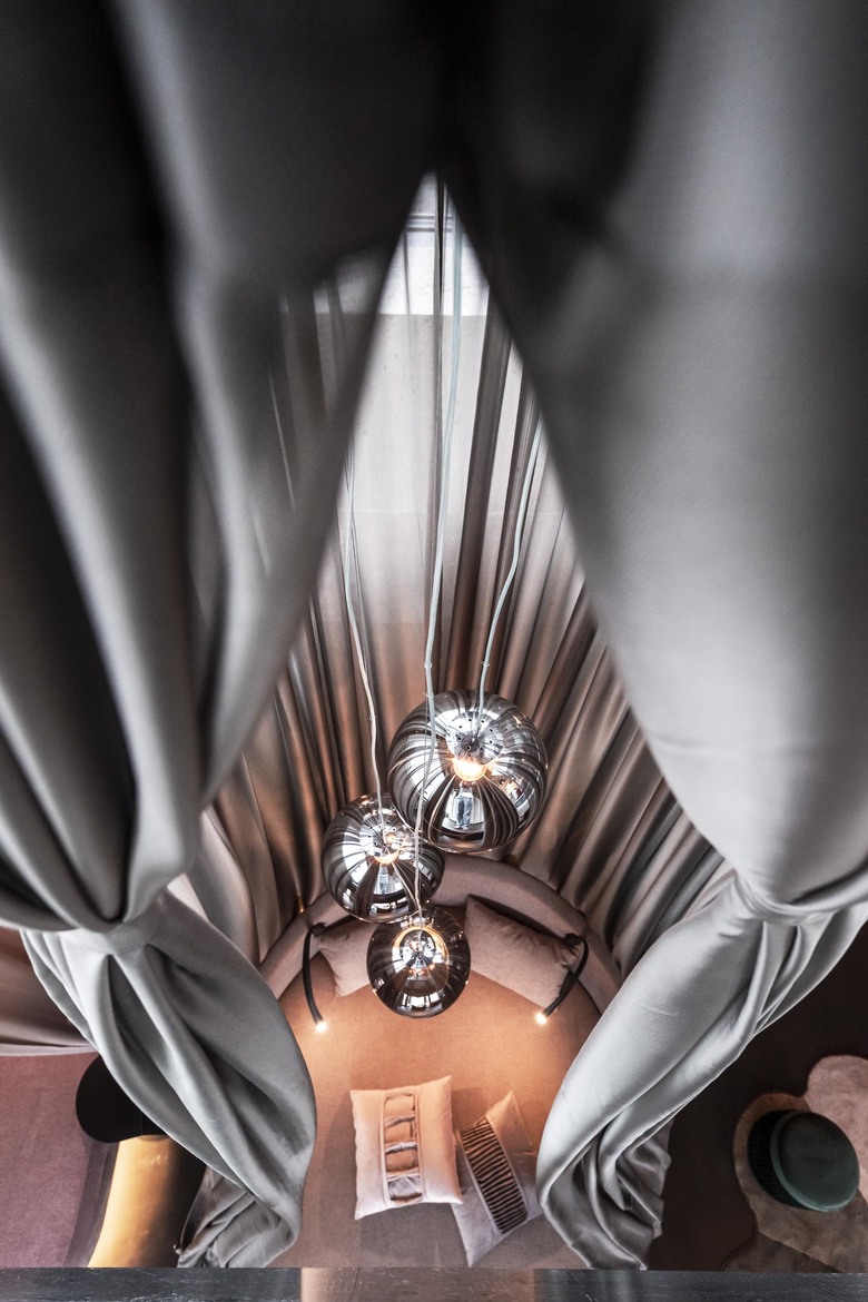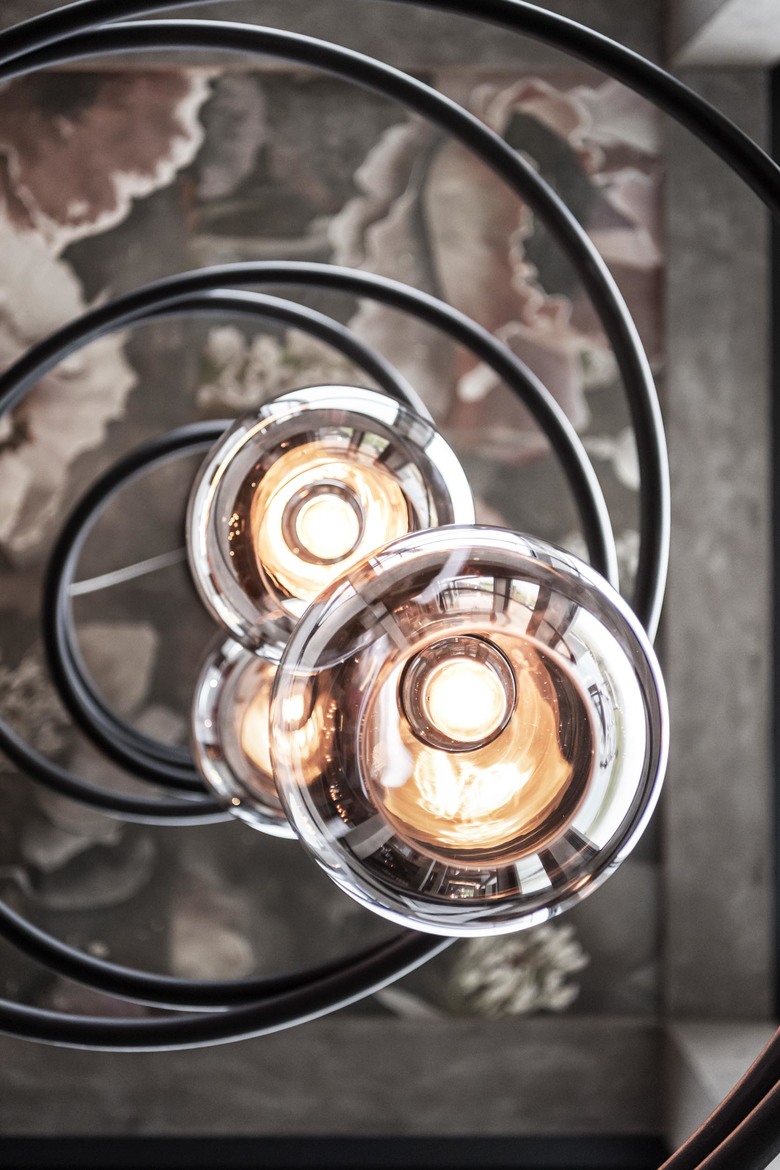 Specific light sources where used to provide illumination, including atmosphere lights inspired by a single motif: a glass sphere. Depending on the environment and individual needs, the fixtures come in different versions: they can be scenic lamps following the twists and turns of the spiral staircase, or a thread of light bulbs reminiscent of the lights in a theatre’s dressing room, and then again, a simple sphere dotting the walls.