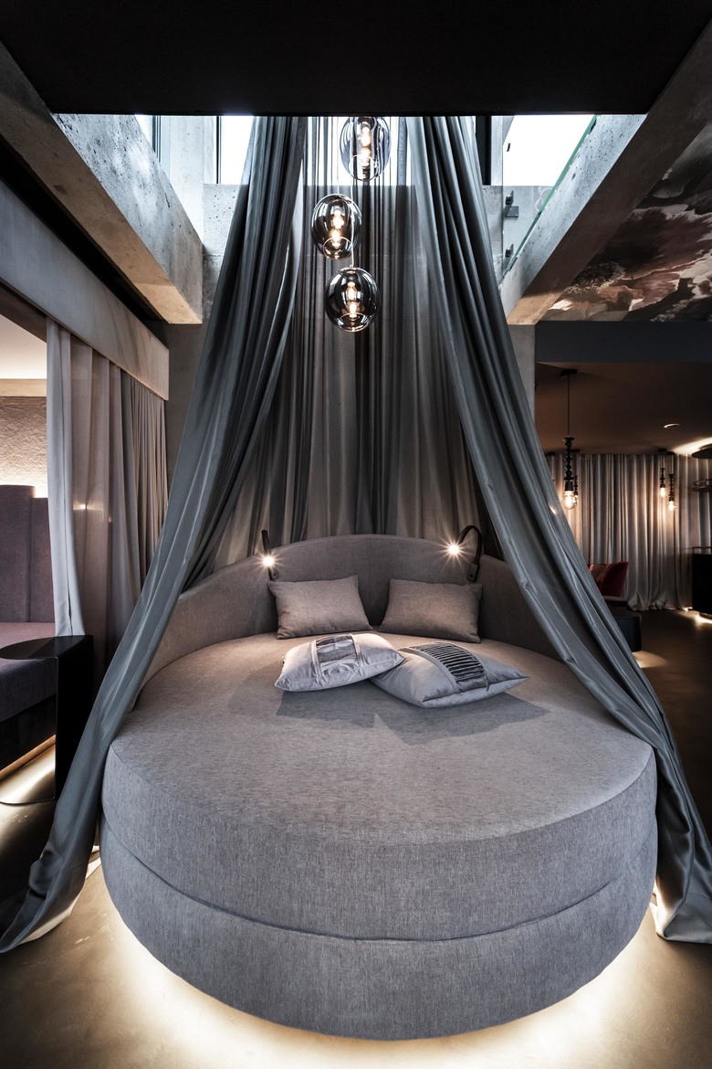 The ground floor also features a private lounge; a lobby and bar for refreshments; a Spa and scenic sauna for approximately 20 people featuring a mini bistro reminiscent of cinema halls, as well as changing booths and showers. Last but not least, a scenic spiral staircase pinpoints the centre of the building and takes revellers to the first floor… where 10 symmetrical chill-out ‘stages’ await them (5 per side).