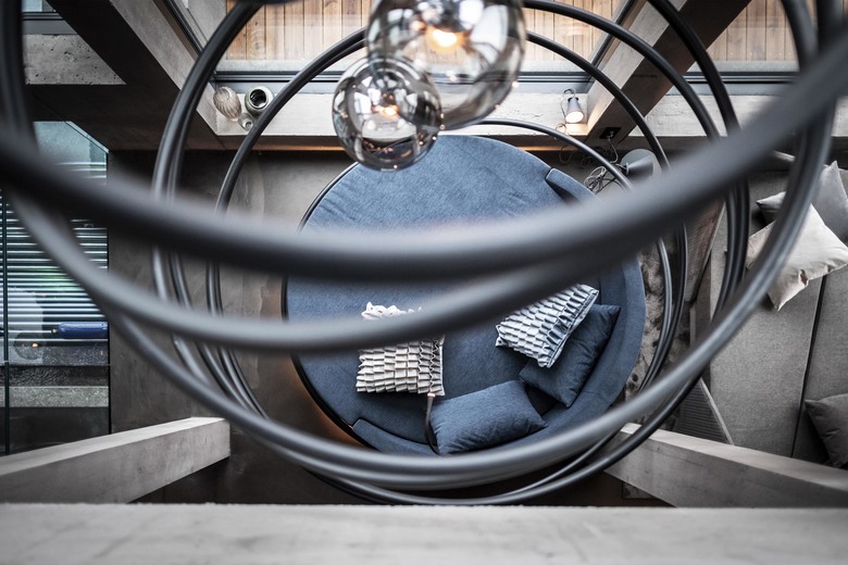 The relaxation areas were developed to look like theatre stages with a view across the mountain. Every ‘booth’ includes two deckchairs featuring different designs: open, spacious areas with huge swings hanging from the ceiling enshrouded by drapery or metal cones framing the mountain alternate with closed balconies delivering increased privacy and relaxation with an omnipresent mountain view.