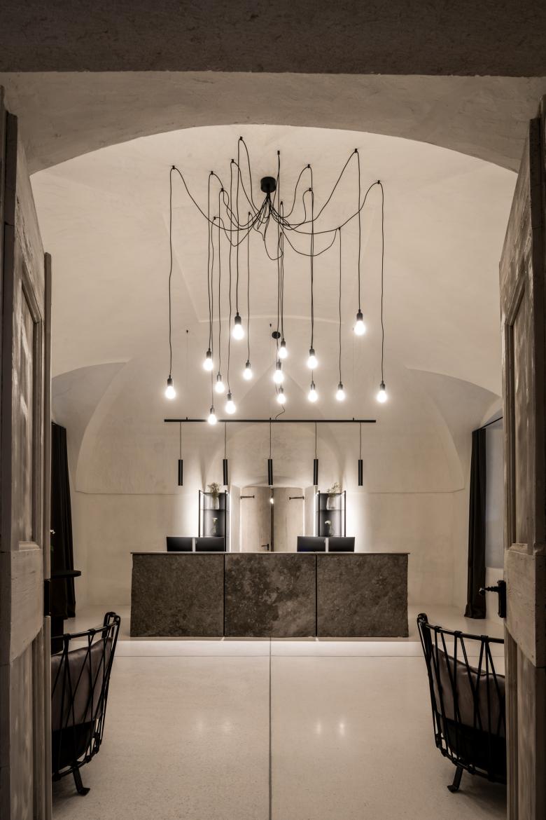 The original ceilings and decorations in the common spaces on the ground floor were conserved and restored. The dominant shades are white, grey and black, the historic colours of the monastery.