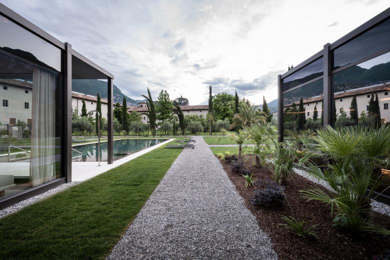 The monumental spaces of a 17th century monastery are brought back to life in Arco, Alto Garda, where noa* has transformed them into a unique hotel, while conserving the charm of the original architecture and its atmosphere of peace and meditation. In the garden, the spa is inspired by certain typical rural constructions, which can be found on the lakes shore.
