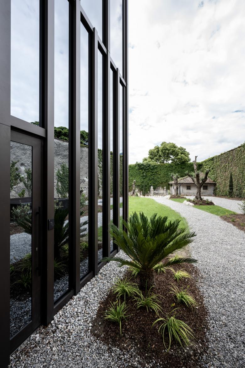 Newly-developed in the monastery garden, the spa consists of seven light glass and metal volumes positioned along a stone spine. The alternation of glass bodies and green courtyards creates an evocative pattern of advanced and set-back volumes.