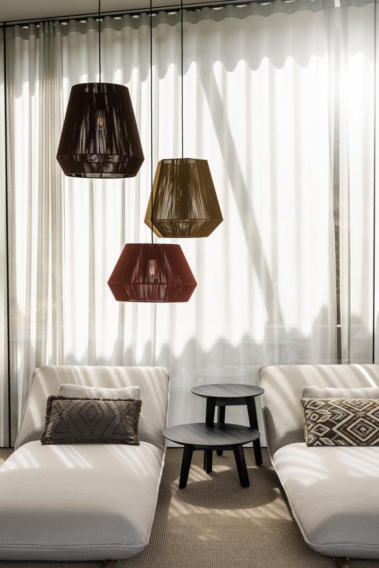 Continuing on the lower level, the passageway leads to the area with the children's pool. Here the elements of earth and water meet. The eye is drawn first to the pool with its organic free form and a water slide, surrounded by intimate alcoves that invite relaxation and play. These are equipped with a wooden floor, deep seat cushions, loungers and armchairs, covered with outdoor fabrics, as well as sisal carpets and fabric lamps with a shade made of yarn. A homely, cosy character and a fascinating play of light and shadow give the room character. Directly above the pool are metal suspensions for hanging plants. Outside is an area with tables, sheltered from the wind and sun, with a lawn extending out towards the swimming pond.