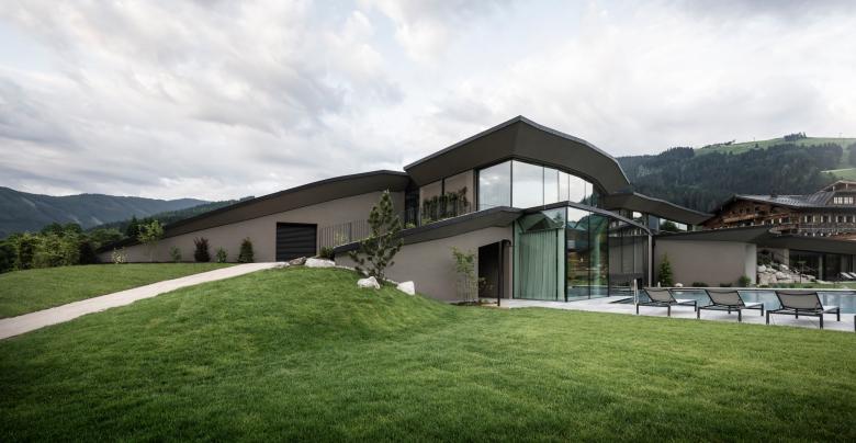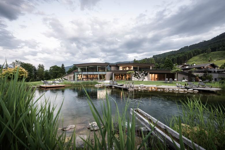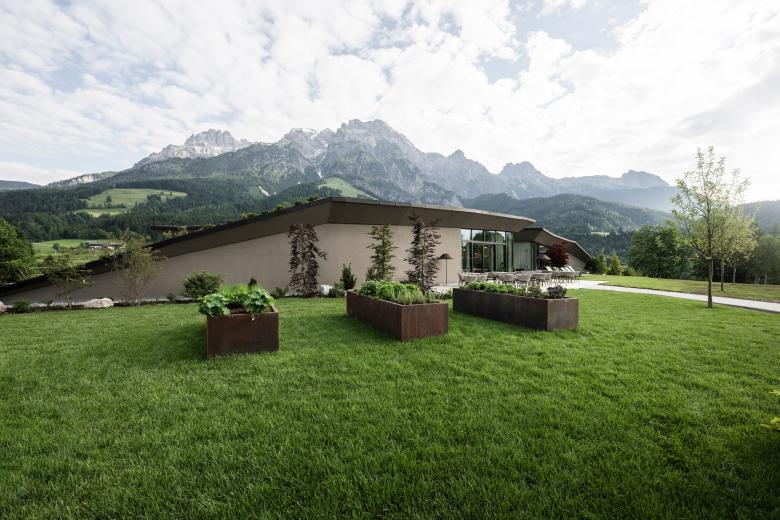A breathtaking mountain backdrop, lush green meadows, a small lake and plenty of fresh air: All of this makes the Puradies nature resort in Leogang in Salzburger Land a haven of vitality, which NOA has expanded with the new spa themed around the elements of fire, water, earth and air.