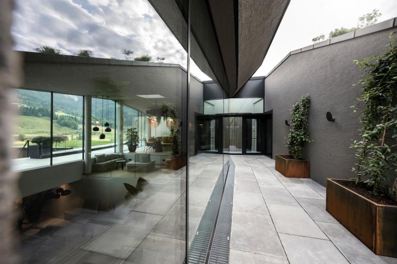 Adjacent to the restaurant, a sun terrace oriented in different directions offers a view of the mountain panorama and the meadows. The space is characterised by the tilted section of the projecting roofs, whose architectural silhouette changes constantly depending on the viewing angle. A very exciting open space is created between two closed structures, which strongly influences the perception of the landscape. Separated from the restaurant by the sun terrace are two other relaxation rooms, one with natural stone dedicated to the earth and the other with sisal surfaces open to the air. From here you can get return to the basement and the main pool. This completes the cycle of the wellness area at the point where the building merges back into the landscape.
