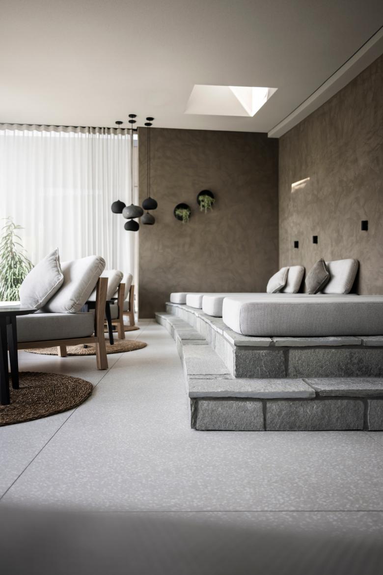 A lawn with raised beds, a column fountain made of Dorfer quartzite and an open-air fire pit extends between the main house and the new building, while underground the existing corridor that previously led to the beauty reception area has been maintained. This is the connecting point for access to the new wellness area. A new long corridor, whose interior design sets the mood for the four element experience, leads past treatment rooms to the sports and fitness room with a view of an inner courtyard with a rock garden. In the corridor itself, the elements of earth and air meet, rendered as a rough, surfaced wall in an earthy hue on one side and light linen fabrics on the opposite side of the window. The mineral, coarse plaster gives the passage tactility, while the light-flooded, lively textiles lend it a mystical air.