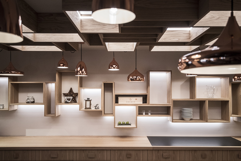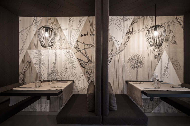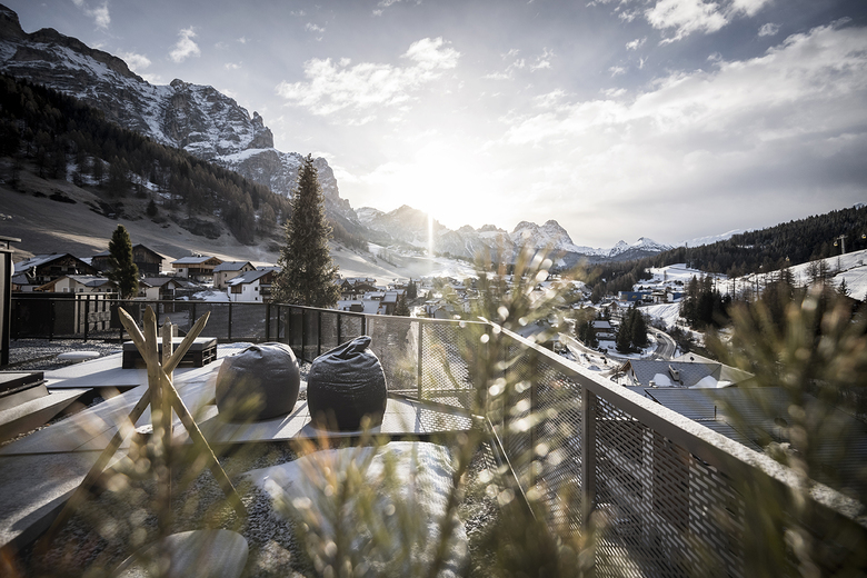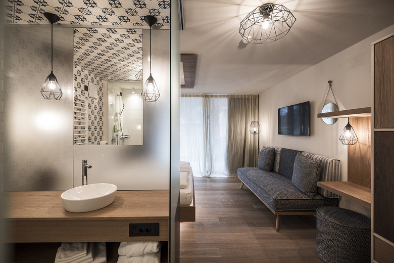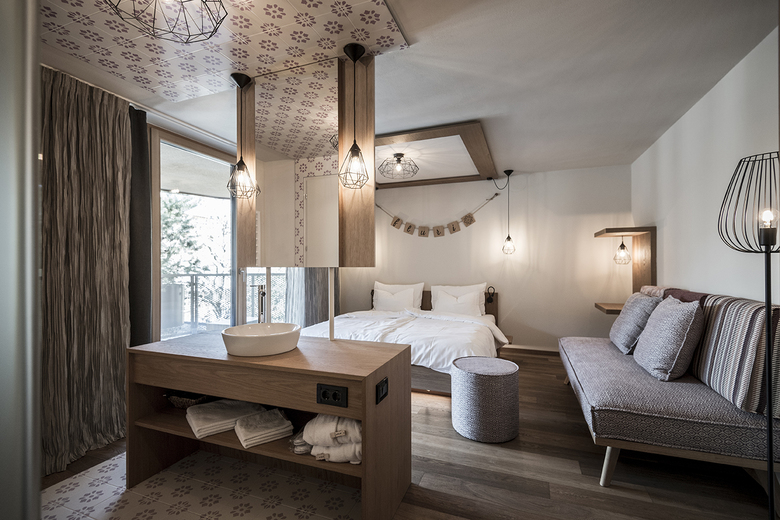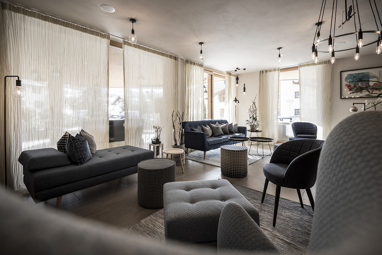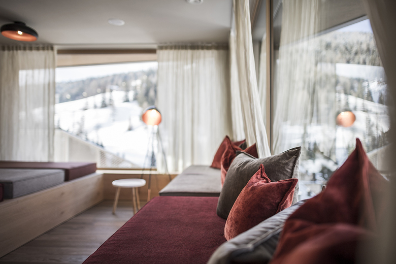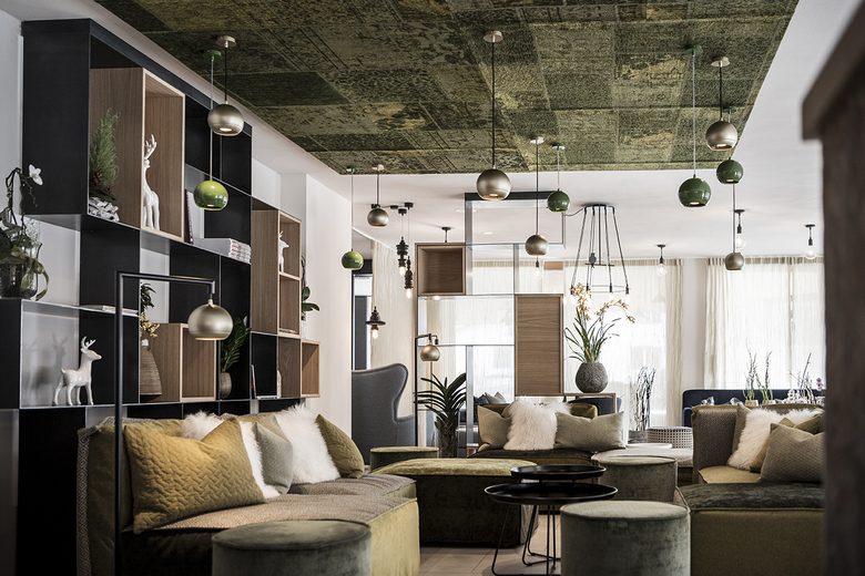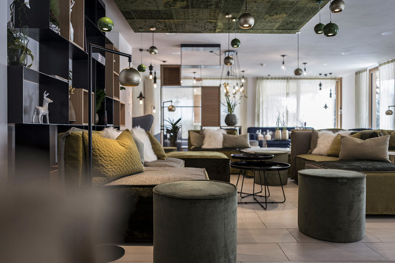 Various lounges and restaurants can be found on the ground floor, always following the alternating natural landscape of the Badia Valley: furniture and sofas in blue, green and brown tones suggest alpine meadows, biotopes, moss forests or rock caves. From the “Base Station” - the reception with gondola – takes you up to the “hut cabins” (rooms & suites), further over the rocks to the summit of snow and ice creating the relaxation area with a view of the Dolomites. The natural experience becomes the main theme of the entire design.