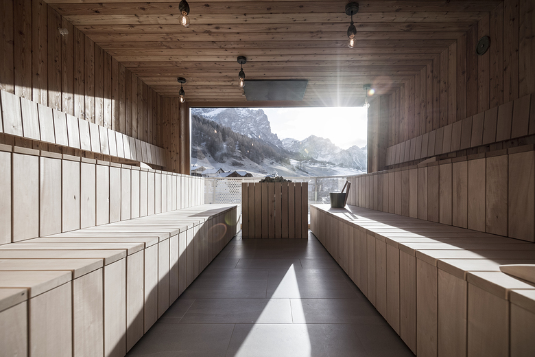Following the motto "Never stop exploring", the concept of movement and the infrastructure in the new Tofana Hotel, follow the principle of a climbing route, which can be traversed by the visitor. The nature and the mountain serve as a stage for various places to linger and relax.