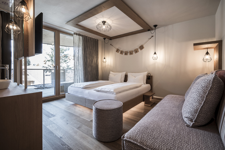 The traditional family establishment was founded in 1933 and is now run by the third generation since 2011. Günther and Verena Frena’s enthusiasm for sport played a decisive role in the design of the new hotel. The dynamic personality of the two Yoga and Pilates instructors, mountain bikers, ski and snowboard instructors and mountaineers has led the new Tofana to adapt to these two athletic powerhouses: the "mountain" becomes an abstract conceptual inspiration for the entire architecture. The outer silhouette is aesthetically pleasing with its unique scenic entourage and reflects the shape of a tree-lined mountain peak. The hotel acts de facto as a "base camp" for the guest.
