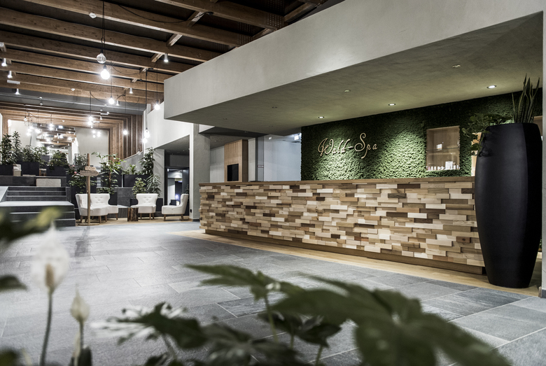 Bridges, paths and alleys border the central lobby. They are in contrast towards the organic shapes of architecture and design elements. The reference to the outside is communicated amongst typical trees of the Bavarian Forest within the interior itself.