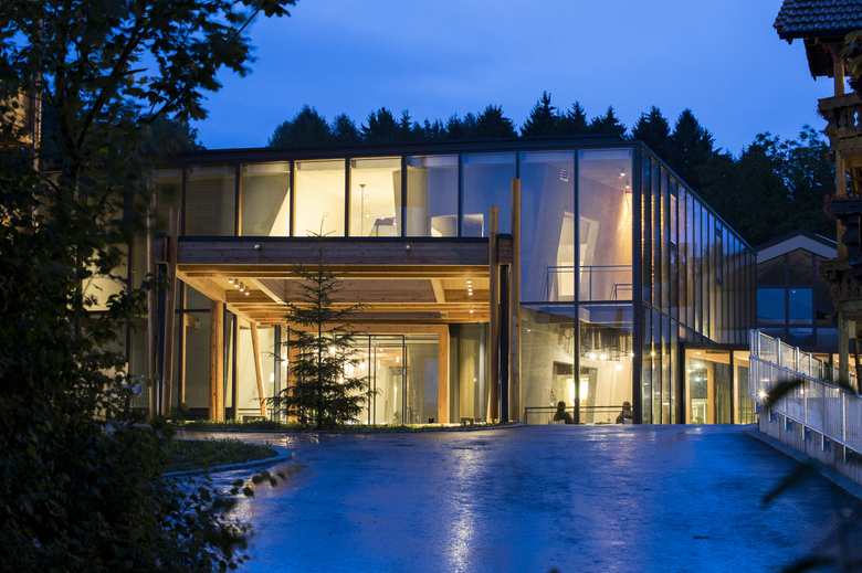 noa* reinvents the Ulrichshof: both Lukas Rungger and Stefan Rier form a new stage, a platform for the concealed. The glazed facades of the lobby and the “Waldpassage” dissolve the built volumes and re-enact the Bavarian forest. The character of the surrounding forest becomes a design principle for the internal spaces. At the same time it defines the basis of a magical stage for fables and fairy-tales. Various “touching points” are implemented with maximum care and crafts. Traces of animals carved into wooden panels become physical and visual moments of storytelling. Full height glazing panels open up the main views towards the outside.