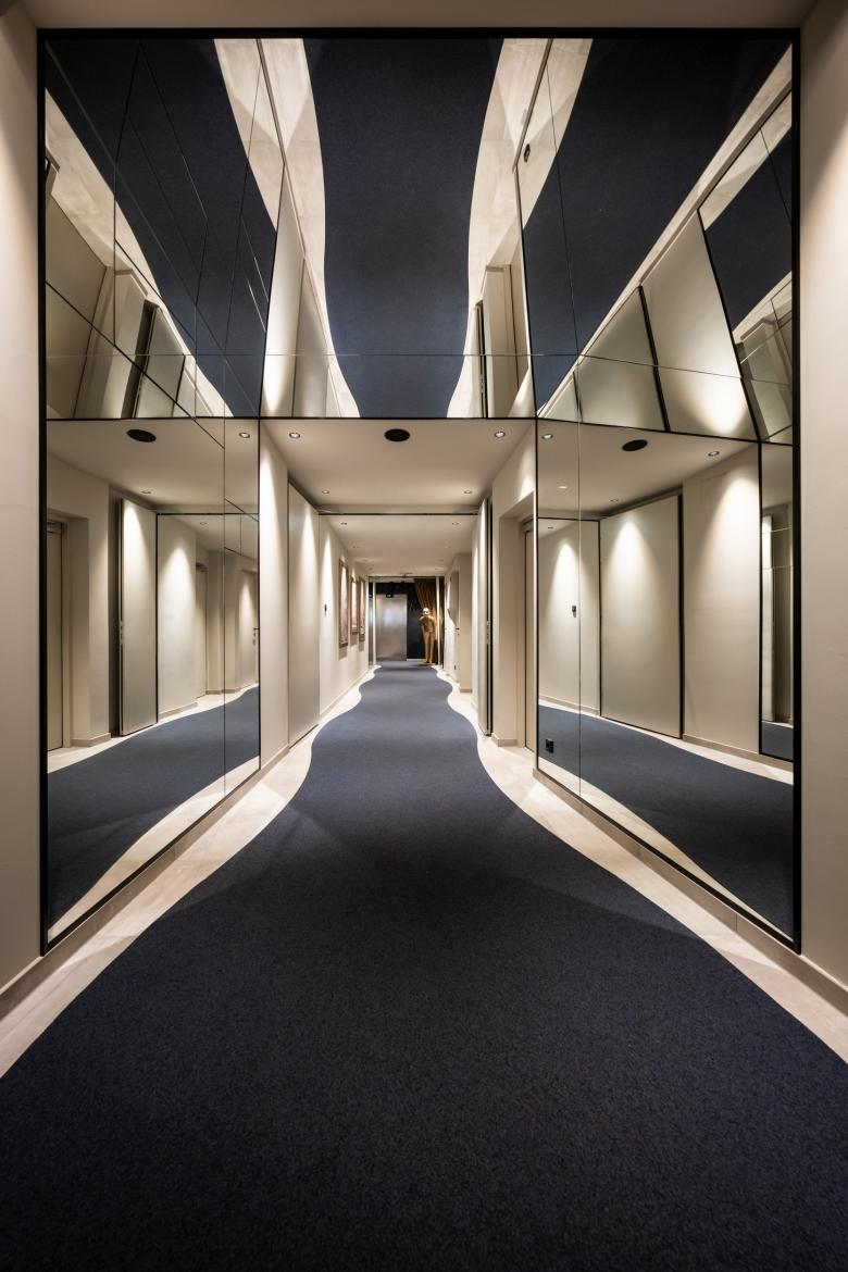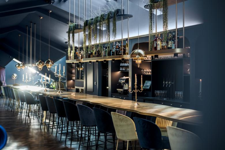 Guests are invited to begin their journey through time on the ground floor: the lift is accessed via a long corridor punctuated by two "mirror locks". Guests see themselves reflected, but at the same time any boundaries are dissolved by the mirrored walls and ceiling and the architecture ceases to exist. From the entrance itself, guests are transported away from their own sense of time. The lift takes them straight to the brand new sixth floor, where a warm welcome awaits. There, the first thing they will notice is a dominant piece of furniture in the long room: a 13-metre-long, custom-made brass table with baroque ornamentation. The table is a multifunctional reception, breakfast buffet, bar, and convivial meeting place in the evening, which is open to non hotel guests as well. The table is further enhanced by the smoked oak floor, and the brass provides a regal contrast with the warm dark blue saturating the room. Blue also features in the name of this iconic venue: “Zur blauen Brigitte” [Blue Brigitte], named after one of the building’s two owners.
