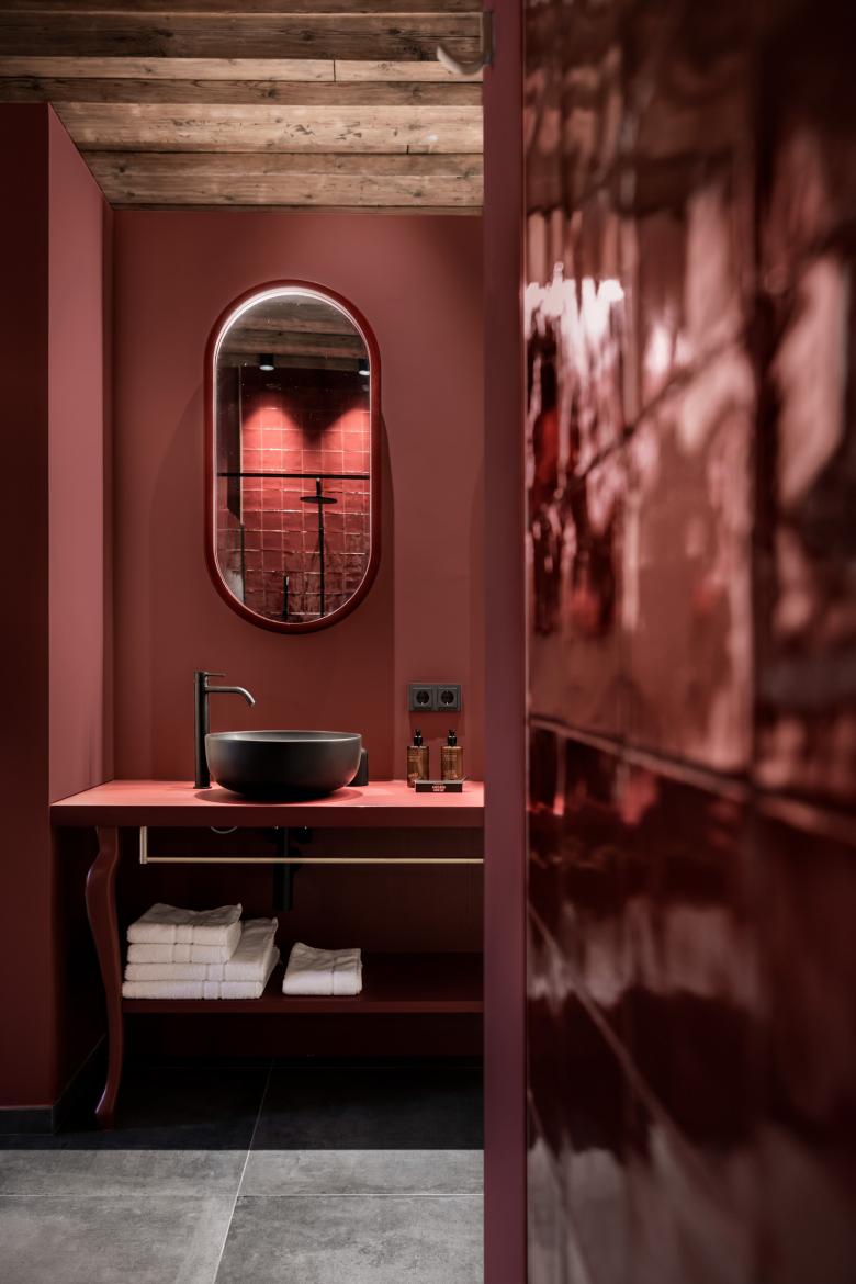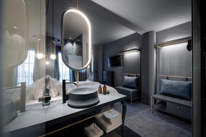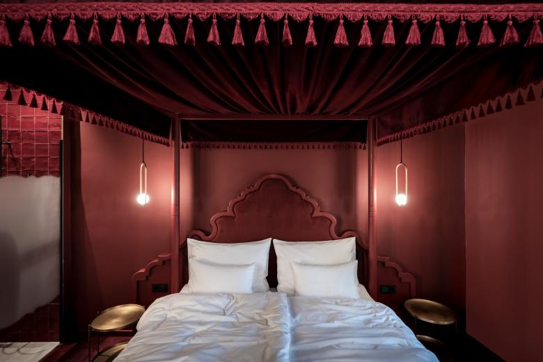 The rooms themselves have consistent colour codes. Each is immersed in a monochrome colour and becomes the setting for the baroque elements. Colour is part of the journey through time that the guest embarks on. Each hue gives an indication of the configuration of the respective room. When compared to the light blue rooms, the red rooms are slightly more spacious, the dark blue rooms have a balcony, and the green rooms have a terrace overlooking the courtyard, while the grey rooms are all twin-bedded. All the furnishings are in keeping with the colour: from carpet and tiles to wall colour, curtains and furniture. The baroque theme is reflected in particular details, for example, one leg of the washstand or a chest of drawers is always “baroquefied”, but it also shines through in other accessories. The baroque touch is further accentuated by a specially created series of photographs of opulently dressed ladies who pick up on the leitmotif of “Baroque Chic Shock” through whimsical accessories.
