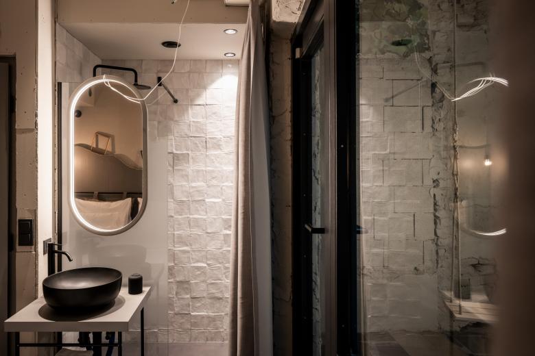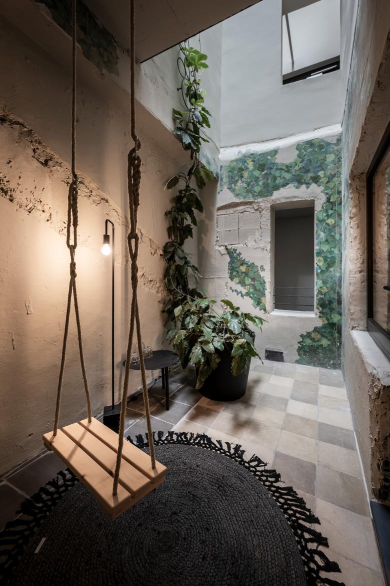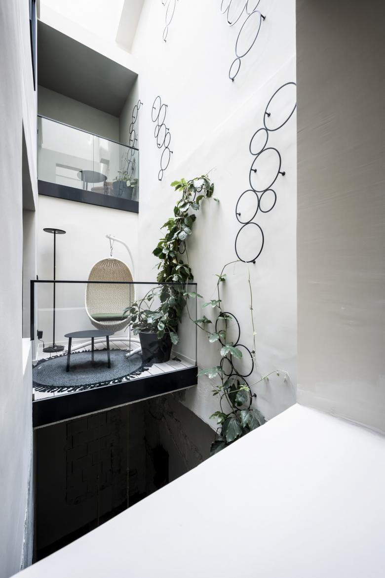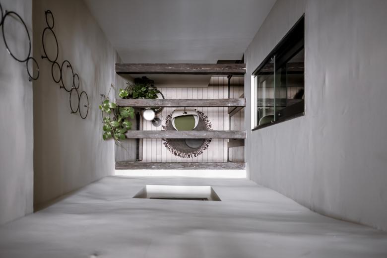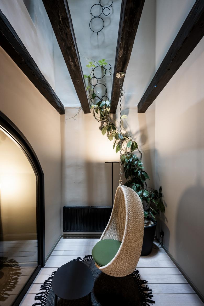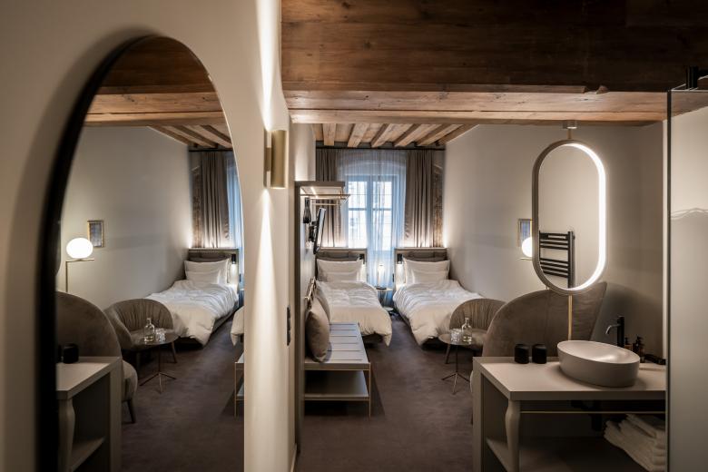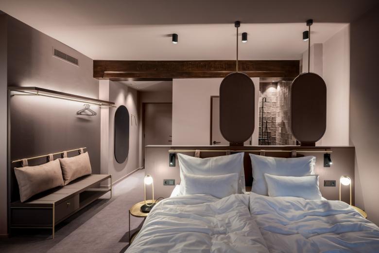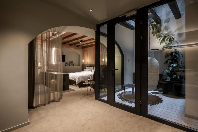 The new rooms and suites – or “chambers”, as the owners affectionately call them – are located on the floors below. Despite the architectural irregularity of these existing floors, with their gothic ceilings, arches and varying room heights, noa* has succeeded in bringing some kind of calm to the madness. The guest rooms facing the street allow you to engage in the hustle and bustle of Innsbruck's old town just by looking out of the window, while those facing the inner courtyard delight with an internal patio or balcony creating a secluded idyll. For the windowless central part of the building, noa* has devised a particularly ingenious way to make use of the space here while allowing these rooms to receive natural light. They are lit via an internal courtyard between the first and sixth floors and have a small private, landscaped terrace.