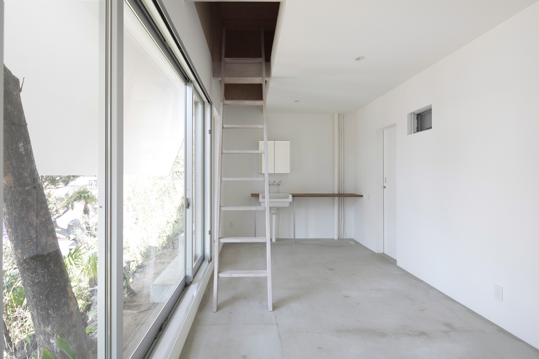 そこで、崖に残る土地の記憶を残すために建築は崖を避け敷地の平らな部分(約16m×4.5m)に配置することにした。そして、崖とほぼ同じ勾配の大きな屋根を架けることにより、崖下の建物からの視線をコントロールすることを試みた。大きな屋根の庇が伸びることにより、軒下空間である1階は外部からの視線を遮り、内部からの視線を崖へと導く。庇が水平距離2mも伸びた軒下空間により、低木は室内に取り込まれ、高木は屋根を貫通し崖と建築との有機的な関係を生む。小屋裏空間である2階では屋根の勾配に合わせて傾斜した窓を目線より上に設けることにより、外部からの視線を遮り屋根を貫通した高木の緑と空の風景だけを室内に取り込むことが出来る。軒下と小屋裏に窓を設ける一方、中間階には窓を一切設けず収納空間とした。