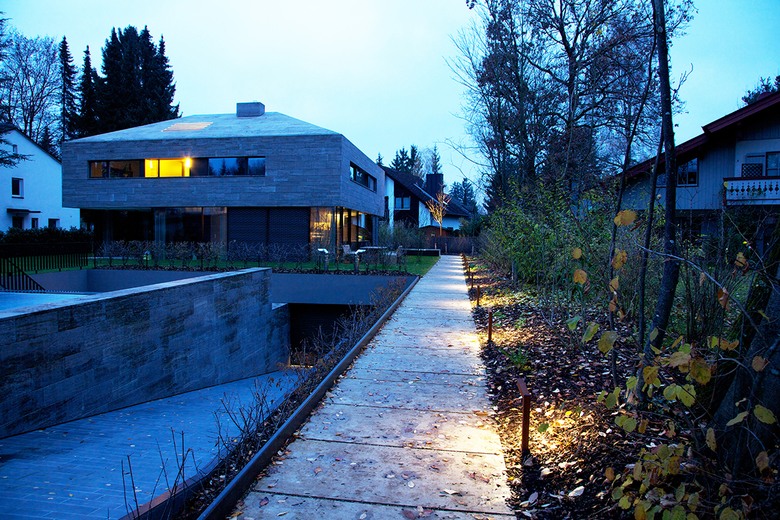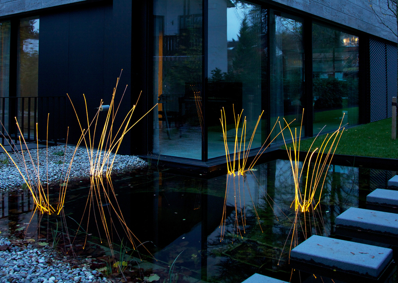 durch eine indirekte Wegebeleuchtung zum Hauseingang geführt; ein Teich wurde mit der Glasfaser-Sonderleuchte "Munich Reeds" in ein poetisches, schimmerndes Lichtobjekt verwandelt. Im Spa- und Wohnbereich sorgen blendungsbegrenzte Downlights für hohen visuellen Komfort, im indirekt beleuchteten Treppenhaus schwebt ein "Hausgeist" im Treppenauge: ein hochglanzpolierter Tropfen aus poliertem Aluminum, der von unten angestrahlt wird. Die Zimmer und Bäder der Familie werden durch ein speziell für das Projekt gestaltete "Leuchtenfamilie" erhellt: spielerisch in verschieden Höhen und Winkeln abgependelt, sorgen Leuchten mit farbigen Stoffschirmen und Stoffkabeln für direktes und allgemeines Licht. Sie sind flexibel an einem Hakenraster fixiert und begleiten das Wachstum (der Kinder) ebenso wie weitere Veränderungen innerhalb der Räume.