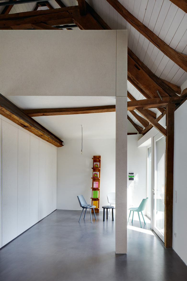 Für den Umbau einer 102 Jahre alten Scheune in Büroräume für The Borsellinos, Design Agentur und Herausgeber des Magazins Aortica, wurden der existierenden historischen Struktur der Scheune moderne Formen und Merkmale entgegengesetzt. Das Äußere und das Dach des historischen Gebäudes sind in schwarz gehalten und kreieren so ein Spannungsverhältnis zum unmittelbaren Umfeld und den angrenzenden, traditionellen Gebäuden. Neue, absolut reduzierte Fenster- und Türelemente kommunizieren ebenfalls die moderne Ästhetik. Im Kontrast zum Äußeren, sind im Inneren des Gebäudes alle Wände in weiß gehalten. Ein speziell entworfenes Möbel, das sich bewusst mit seiner geradlinigen Form vom Bestand absetzt, beherbergt neue Funktionen wie WC, Küche, Schrank, Treppe und die zusätzlichen Arbeitsplätze auf der Galerie. Die Eigenständigkeit der Struktur wird dadurch betont, dass sie orthogonal frei im Raum steht und sich nicht an den schrägen Winkeln des Bestandes orientiert. Das Projekt wurde zusammen mit Architekt Fabian Mainzer entworfen und in enger Abstimmung mit den Besitzern realisiert.