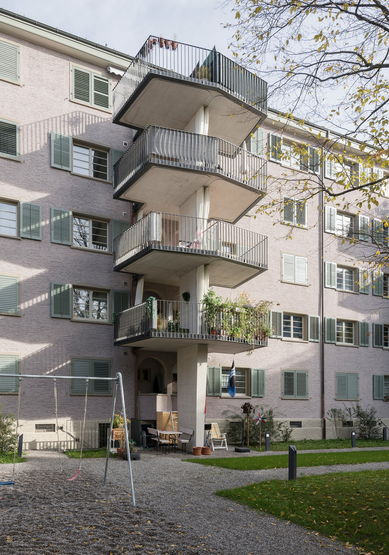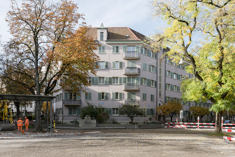 Röntgenplatz in der Stadt Zürich. Die Siedlung besteht aus einen Rand- und einem