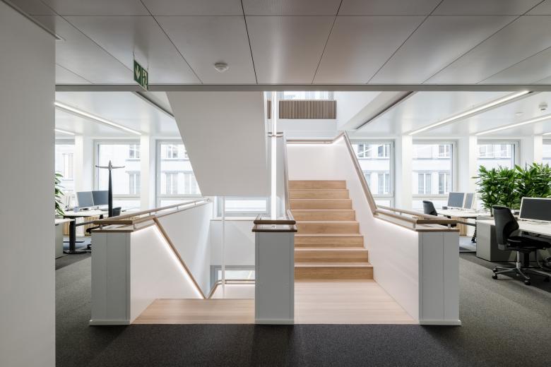 Die helle und dezente Materialwahl der Oberflächenmaterialien an Wänden, Decken, Türen und festen Einbauten werden durch den Einsatz von farbigen Möbel, Pflanzen, einem kontrastreichen Terrazzo im Erdgeschoss sowie einem dunklen Teppich in den Bürogeschossen ergänzt.