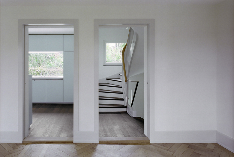 Die Küche mit einem langen Bandfenster nimmt Bezug zu den umliegenden Gärten auf. Das Wohnzimmer ist vergrössert und in seiner Detaillierung beibehalten worden.