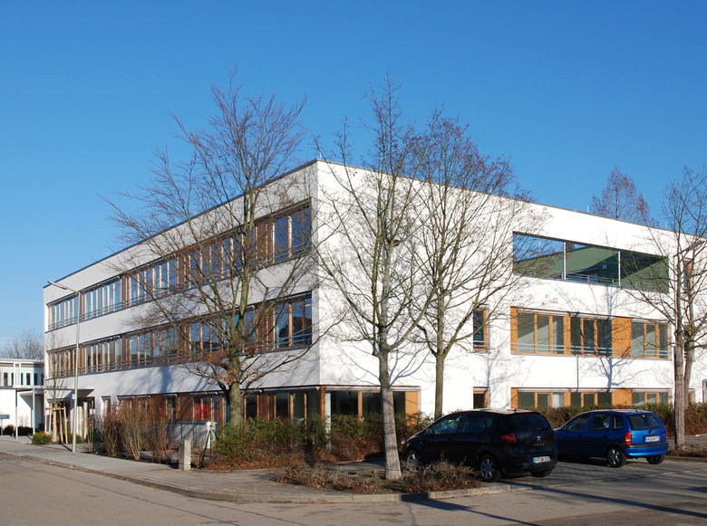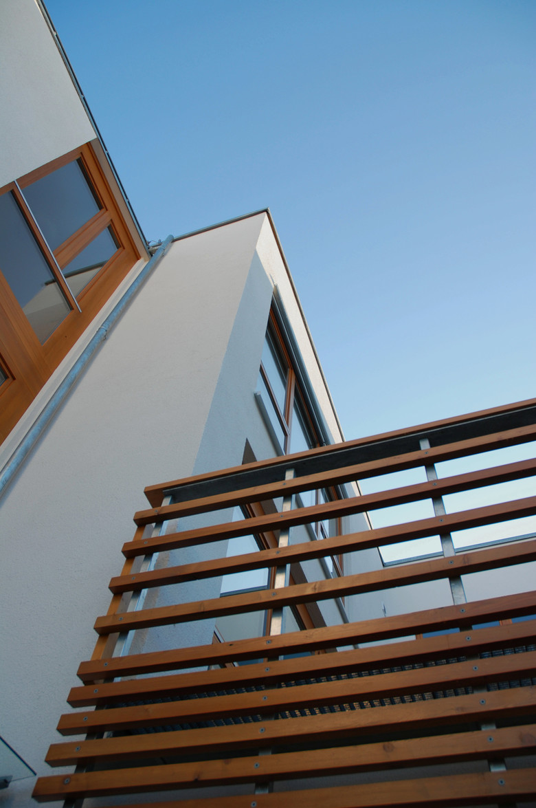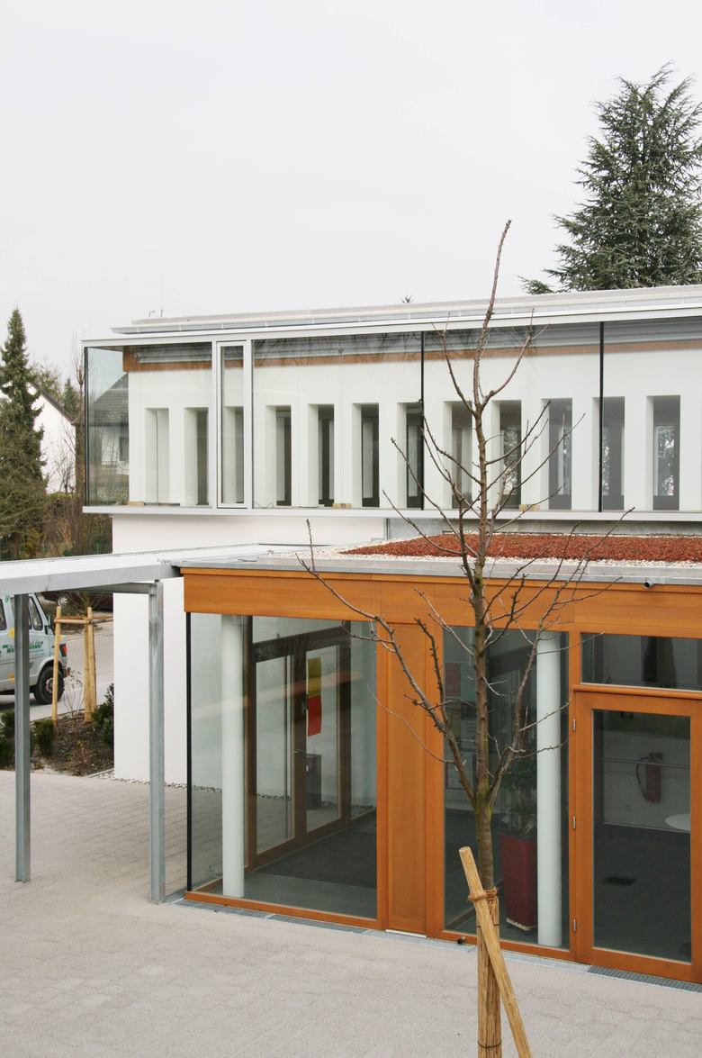 Entwurfsgedanken – Das Gebäude liegt am Ende einer Sackgasse im Stadtteil Hagsfeld und wird östlich vom Friedhof begrenzt. Der Ort verlangt also eine zum Friedhof orientierte ruhige und zurückhaltende Fassade auf der Straßenseite, am Ende einer Sackgasse aber einen visuellen und räumlichen Akzent um nicht in der Masse der angrenzenden Alltagsbebauung aus den 60er und 70er Jahren unterzugehen.