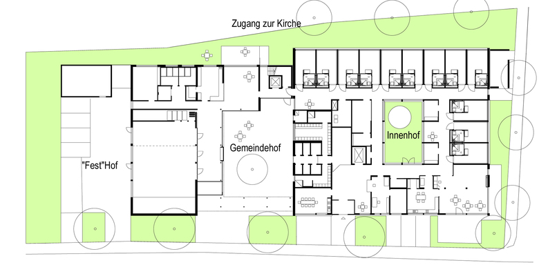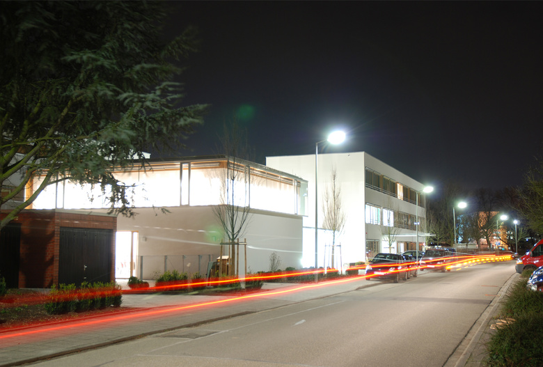 Das Gemeindezentrum fügt sich wie oben erwähnt über den Innenhof räumlich an und schafft über diesen Hof eine für das Gemeindeleben räumlich sehr attraktive Zwischenzone. Der Gemeindesaal, den die Gemeinde zwischenzeitlich liebevoll ihren "Leuchtturm" nennt, ist bewusst an die Straße gerückt und soll über seine Gestaltung auf die besondere, dem Gemeinbedarf dienende Nutzung am Ende einer langen Sackgasse hinweisen. Dieser zeichenhaften Funktion wird die Architektur offensichtlich in wohltuender Weise gerecht. Es freut uns besonders, dass die Gemeinde über den Neubau eine starke Belebung erfährt. Die Gemeinde hat einen neuen Aufschwung erhalten und ist sehr glücklich über ihr Neues Gebäude, insbesondere über die Nähe zu einer ihr wichtigen sozialdiakonischen Einrichtung, dem Fachaltenzentrum.