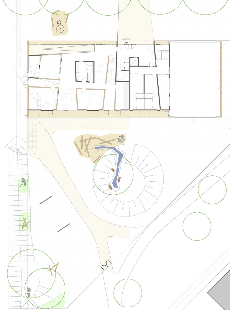 Konzept – "Ein Gebäude wie eine kleine Landschaft - eine Raumlandschaft" könnte man den Entwurfsansatz im Inneren des Gebäudes beschreiben. Schräge Wände, Rampen, Mulden, Treppen und Plätze spiegeln die Interessen der Betreiber und die mögliche Interaktion der Kinder wieder: bewegen und entdecken - verstecken und treffen - ruhige, fast meditative Raumkompostion und die Dynamik des Sports.