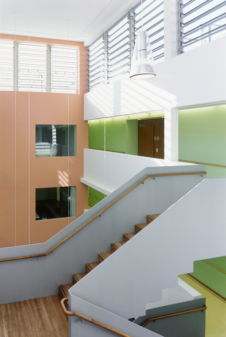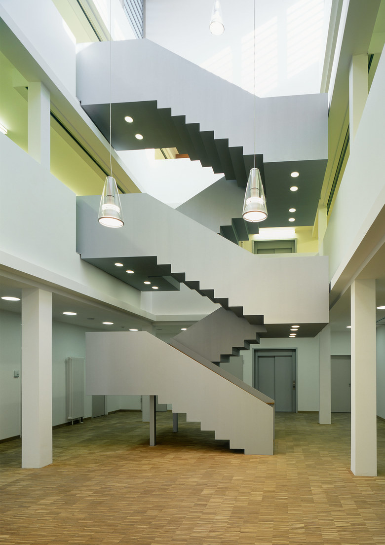 Städtebau – Das Pflegeheim ist 3- , das Betreute Wohnen 5- geschossig. Die Gebäude nehmen die Flucht der Huttenstrasse auf und setzen die Bauflucht der bestehenden Bebauung fort. Im Erdgeschoß werden die Räume aus der Bauflucht der Huttenstraße zurückgenommen um zwischen der Straße und der Nutzung der angrenzenden Räume den notwendigen Abstand herzustellen. Durch die angepasste Farbwahl der Putzfassde und Fensterelemente werden die neuen Gebäude in den bestehenden Straßenzug integriert. Die neuen Baukörper nehmen die Höhenbezüge der bestehenden Baukörper auf und vermitteln zwischen den Wohngebäuden der Huttenstraße und dem bestehenden Pflegeheim.