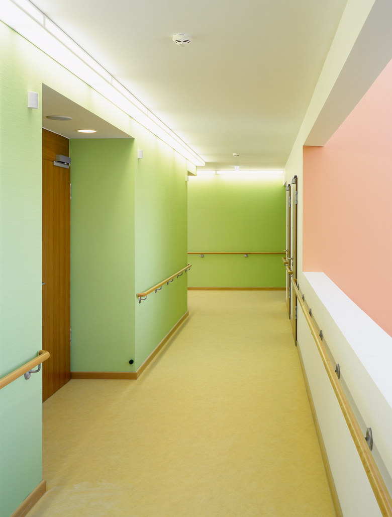 Ein Haus wie eine Stadt, eine Stadt wie ein Haus – Dieser Gedanke Albertis, des italienischen Baumeisters der Renaissance, spiegelt sich im Entwurfsansatz des Pflegeheims wieder: Man erkennt öffentliche und private Bereiche, Straßen und Wege, Plätze. Durch offene Zäsuren ist das Gebäude in 3 Bauteile gegliedert.