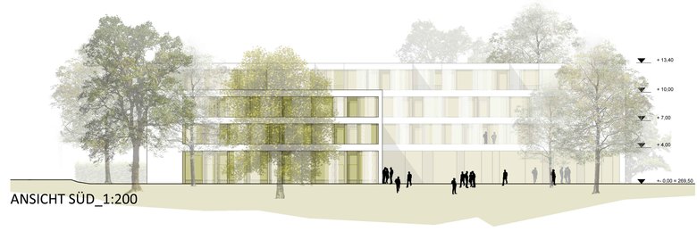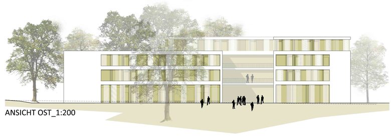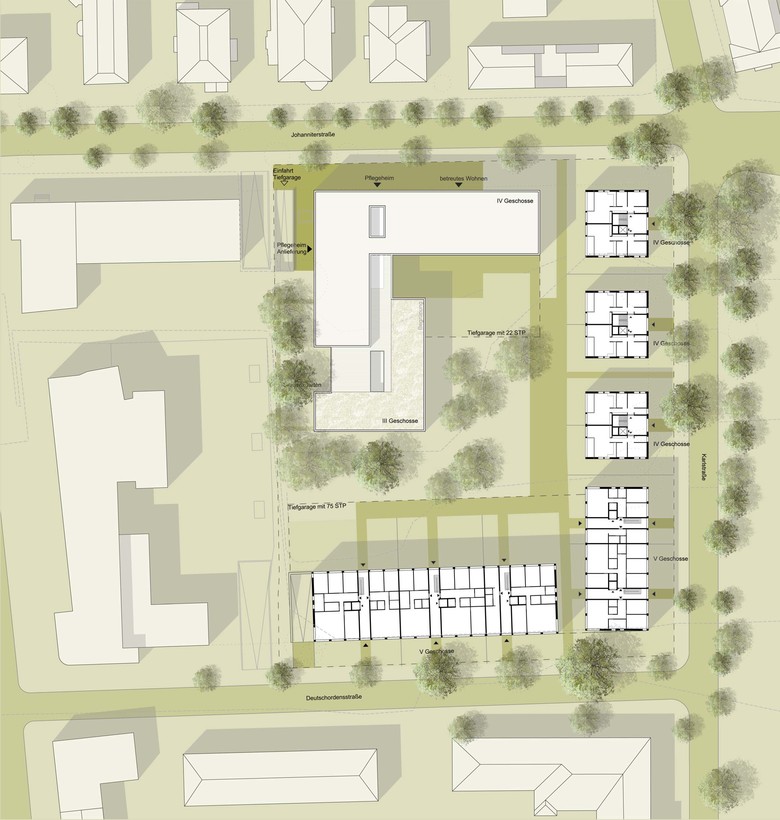 Städtebau – Die städtebauliche Dichte nimmt kontinuierlich von der Innenstadt kommend in Richtung NO ab, die Bebauung lockert sich auf. Diese Tendenz bildet sich auch im geplanten Quartier ab. Im Quartier selber ist uns eine gleichberechtigte Platzierung von Wohnen und Pflege wichtig. Beide sollen eine Adresse an der Straße haben, am begrünten Innenhof partizipieren und unabhängig voneinander realisierbar sein. Der Baumbestand im Innenhof soll weitestgehend geschont werden, insbesondere die besonders wertvollen Bäume.